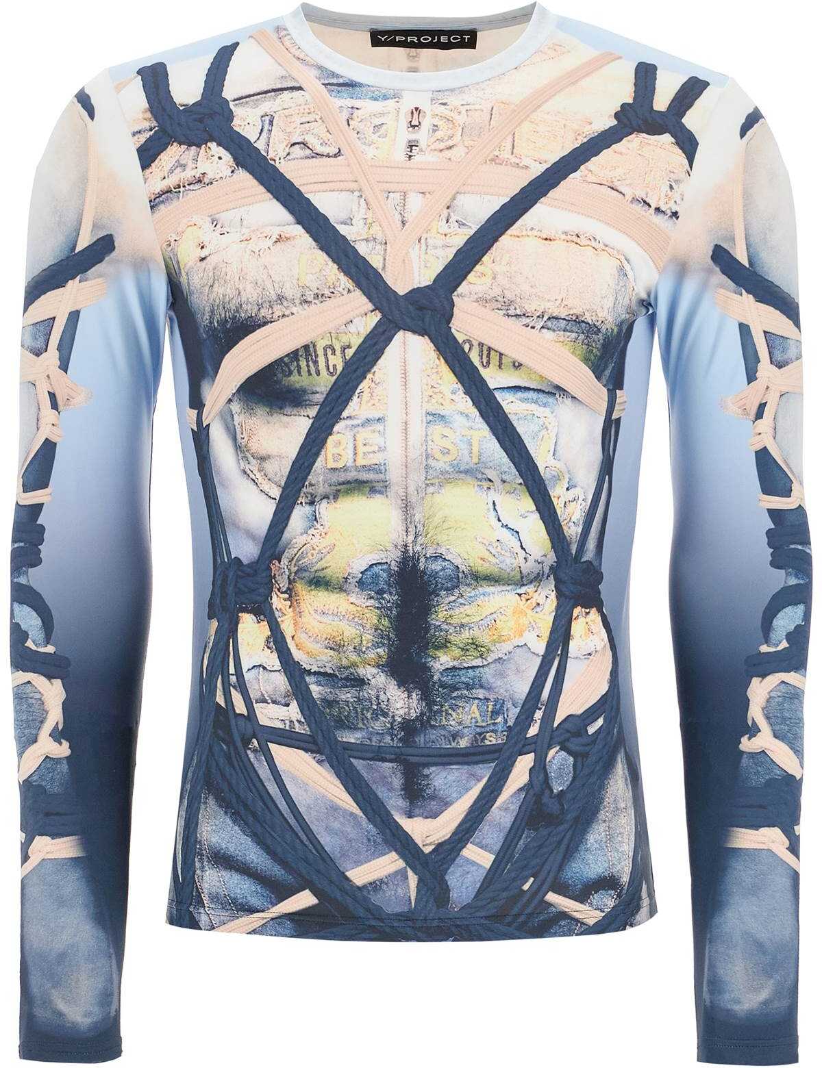 This Y/Project long-sleeved t-shirt is made of soft lycra with an all-over Bondage print, featuring a tight fit that creates a second skin effect. It has a micro ribbed crew neck finish and the model is 182 cm tall and wears a size M.
