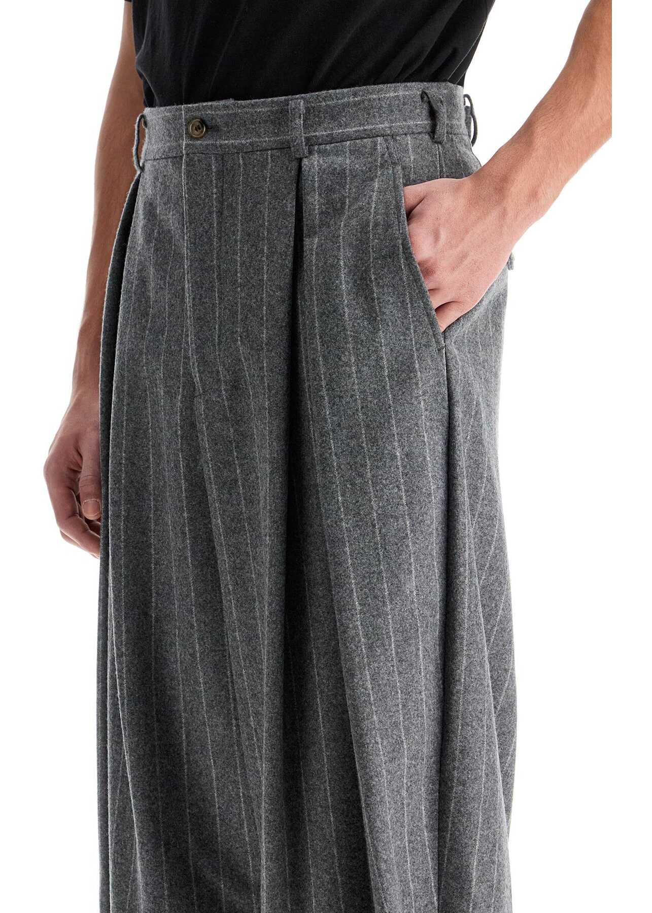 These Homme Plus pants from Comme Des Garçons are made of pure wool with an all-over pinstripe pattern. They feature a wide and tapered cut, enhanced by front pleats. The front closure is secured with a button and hidden zipper, while the waist has belt loops for added convenience. French pockets add to the functionality of these pants, which also have back welt pockets, one of which has a flap and button. The model is 182 cm tall and wears a size