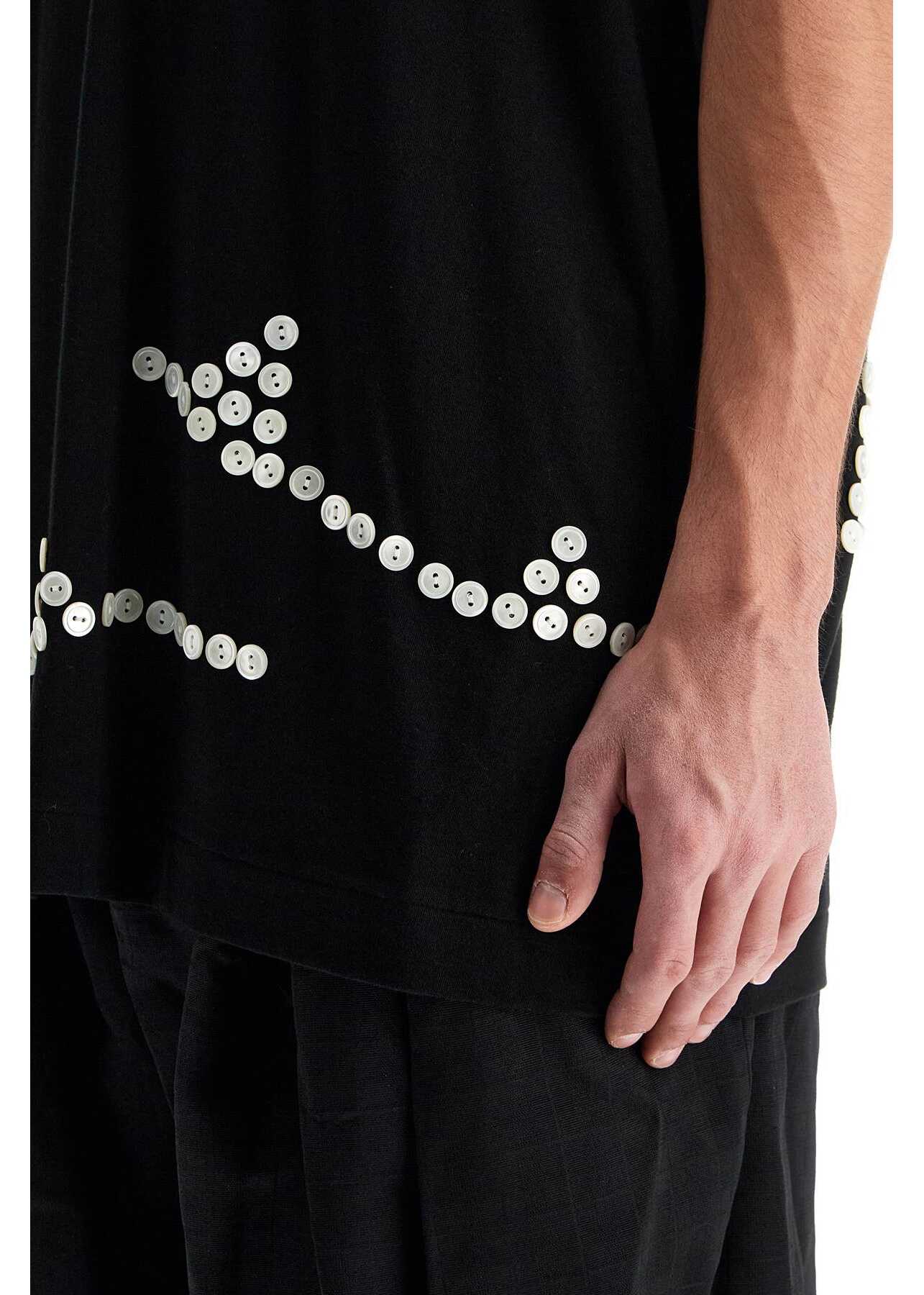 This T-shirt from the Homme Plus line by Comme Des Garç ons is made of pure cotton jersey and features a geometric pattern created by embroidered buttons at the bottom. It has a crew neck and boasts an oversized fit with low-cut sleeves. The model is 182 cm tall and wears a size M.