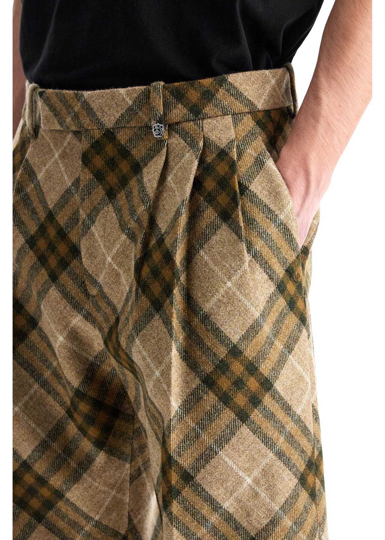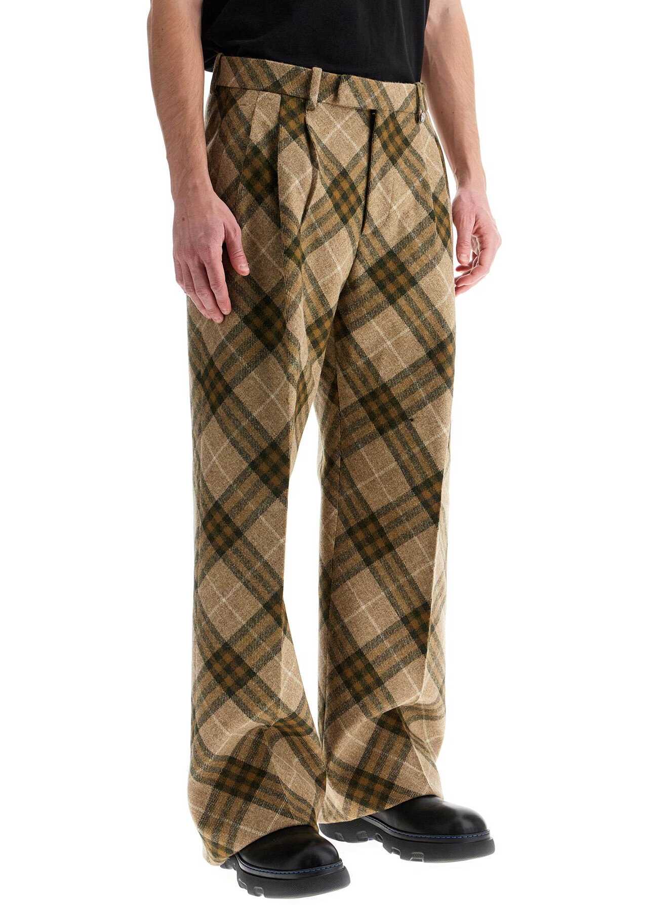 These tailored trousers are made of sturdy brushed wool fabric with a Burberry Check pattern. They feature a straight and oversized cut with double pleats, four pockets, and a logo charm on the front belt loop. The closure is with a zip and hidden hooks, and the interior is fully lined. Hems need to be finished. The model is 187 cm tall and wears size IT 48.