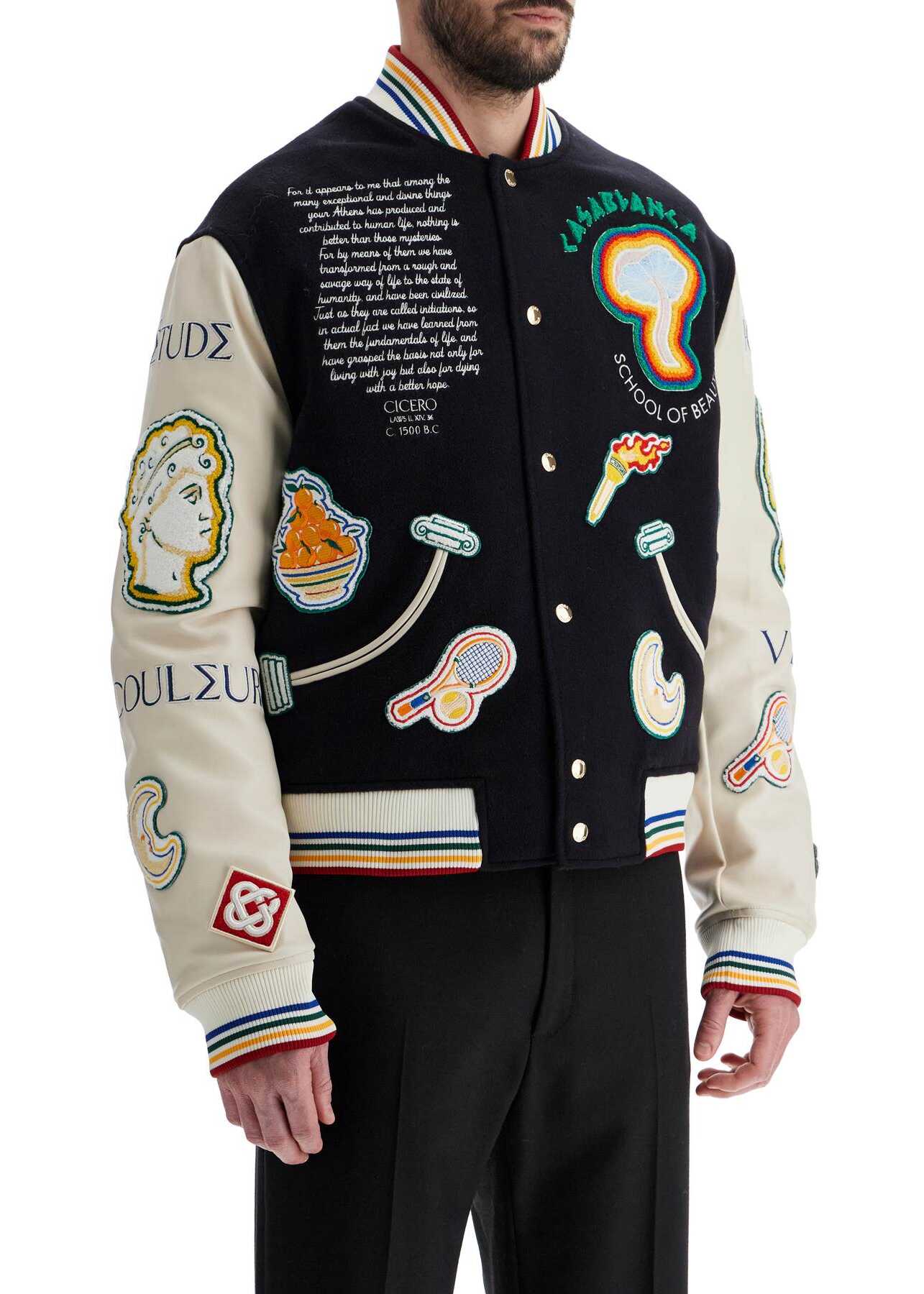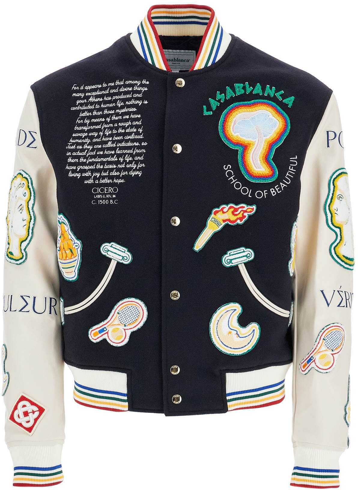 Casablanca wool bomber jacket featuring all-over multicolored embroidery and appliques. The classic construction is enhanced by contrasting lamb leather sleeves and pocket trims, ribbed striped edges, and a snap button closure with gold buttons. Fully lined interior, regular fit. The model is 187 cm tall and wears size M.