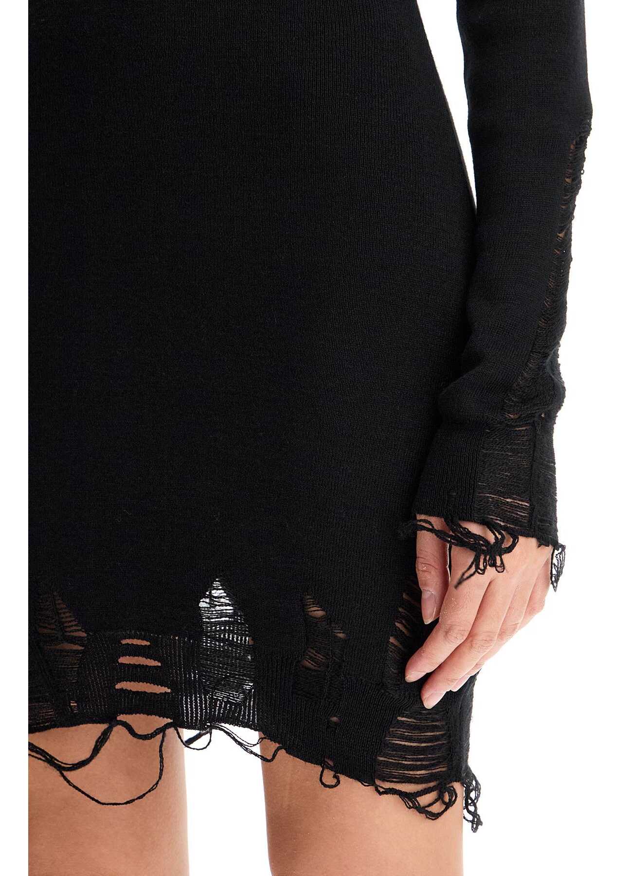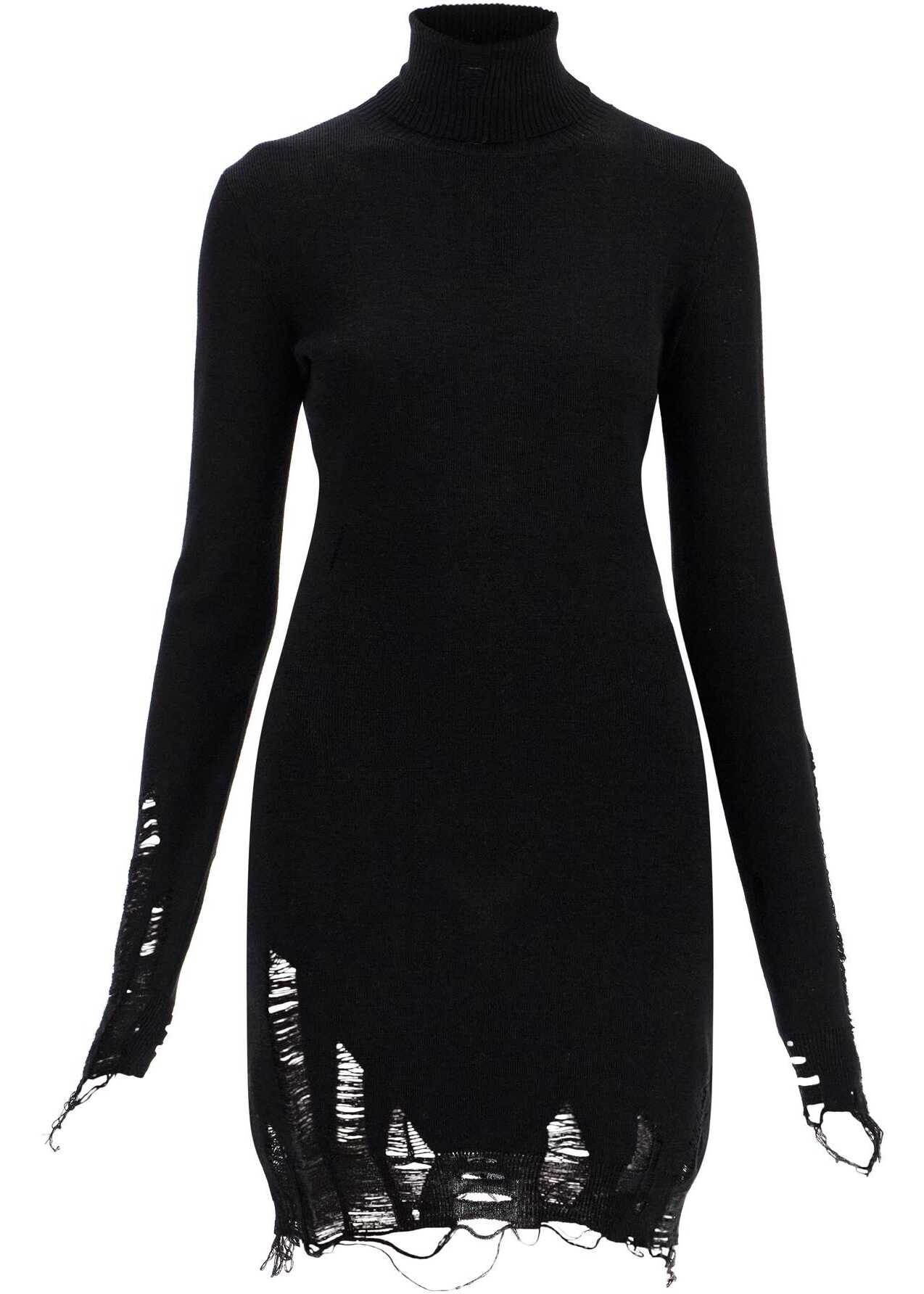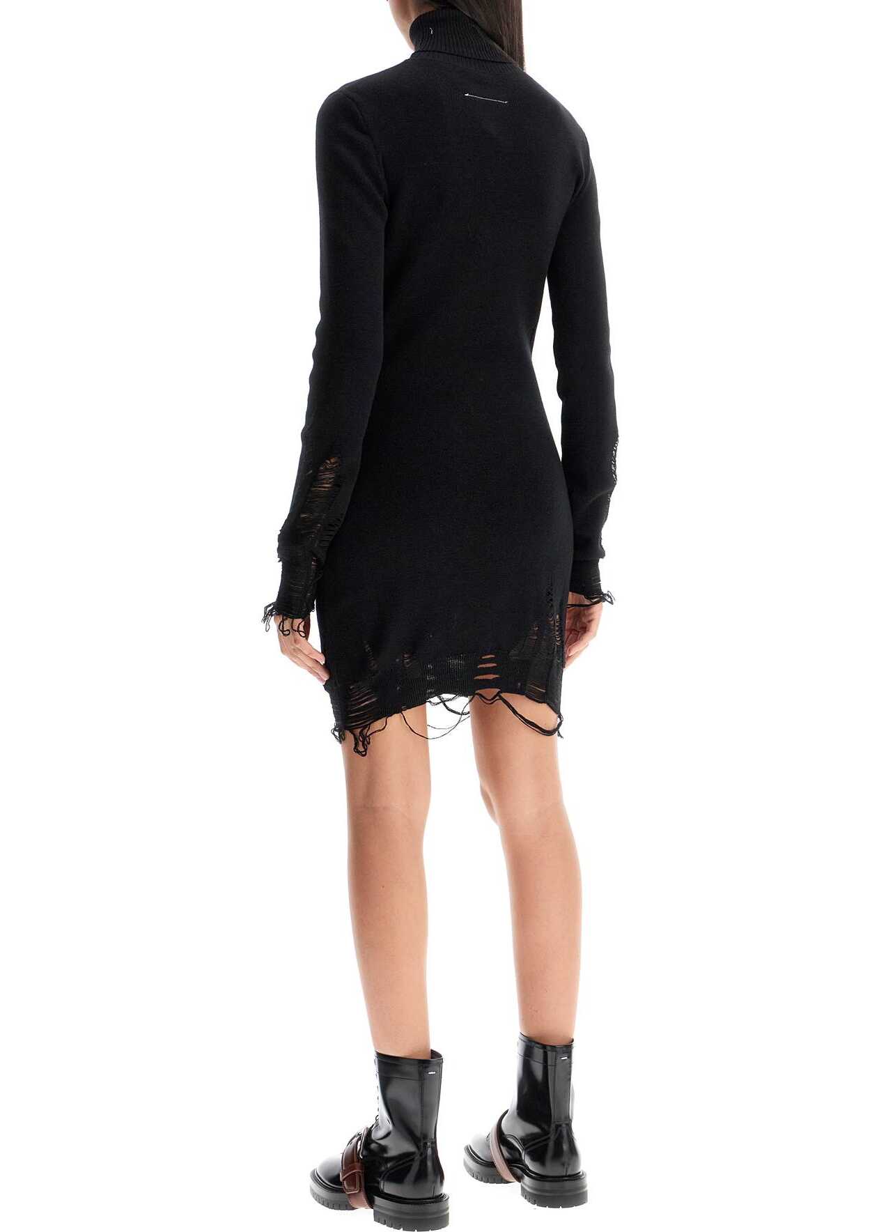 This high-neck mini dress from Maison Margiela's MM6 collection is made of a wool blend knit, featuring a fitted silhouette with long sleeves and finished with destroyed details. The model is 177 cm tall and wears size S.