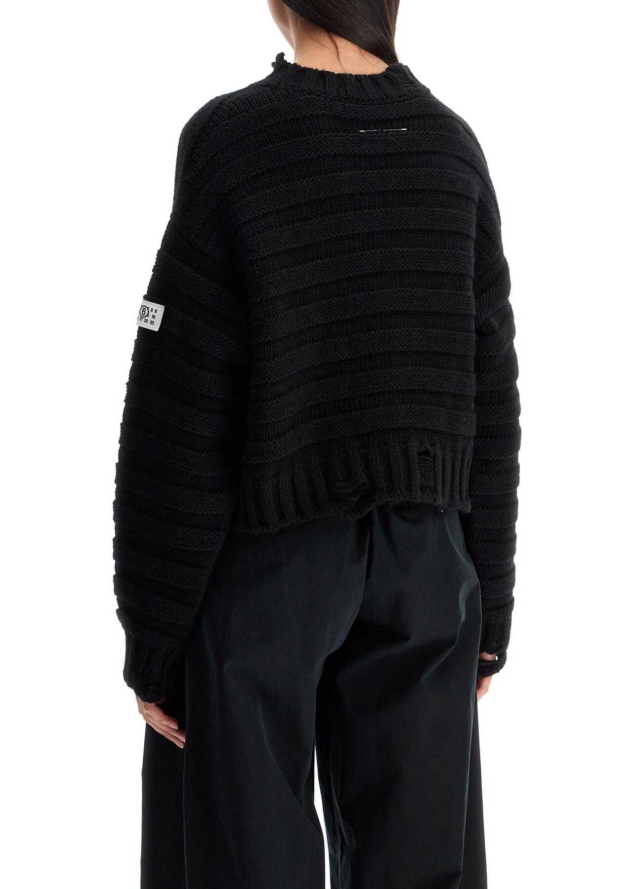This MM6 Maison Margiela pullover is made of a blend of virgin wool and features distressed details on the crew neck and edges. It has a Numeric Logo label on the shoulder, iconic stitches on the back of the neck, dropped shoulders, and a boxy fit. The model is 177 cm tall and wears a size S.