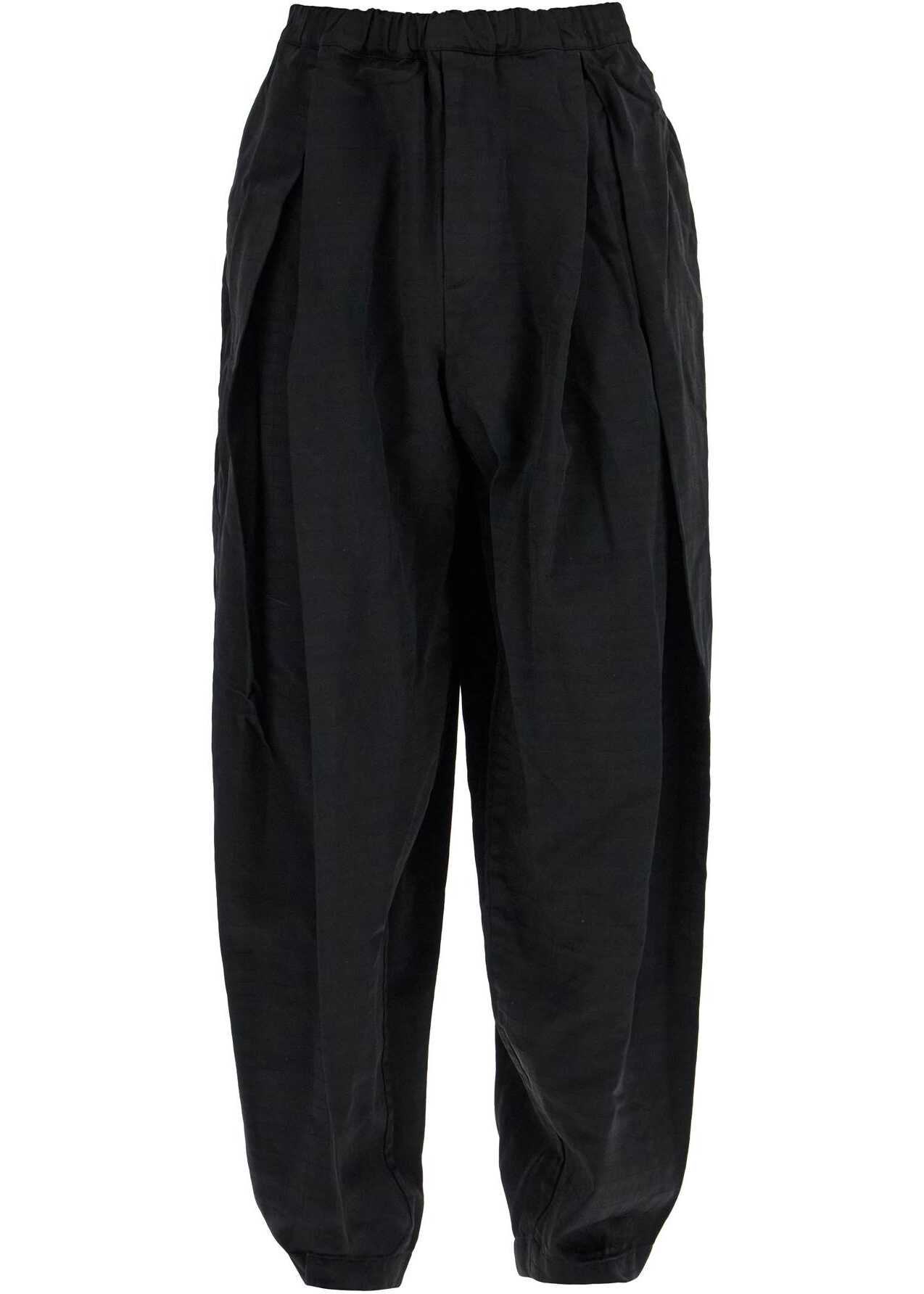These Black harem pants from Comme Des Garç ons are made of technical fabric with a textured check pattern. They feature a wide and tapered silhouette, enhanced by front pleats. The elasticated waistband can be adjusted with an internal drawstring, and there are pockets on the sides and back, one of which has a flap and button closure. The model is 182 cm tall and wears a size M.