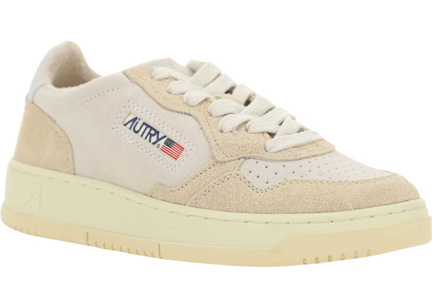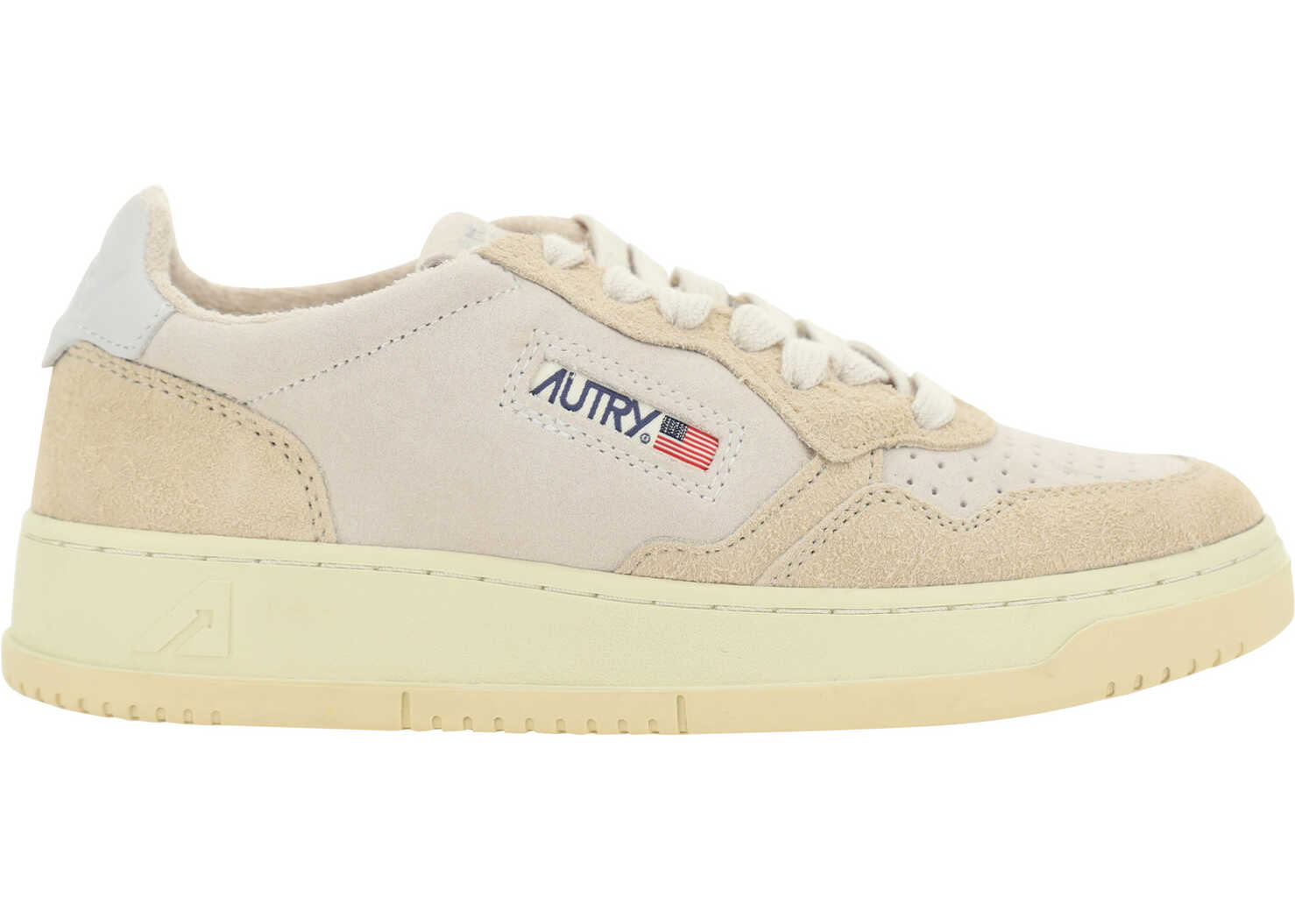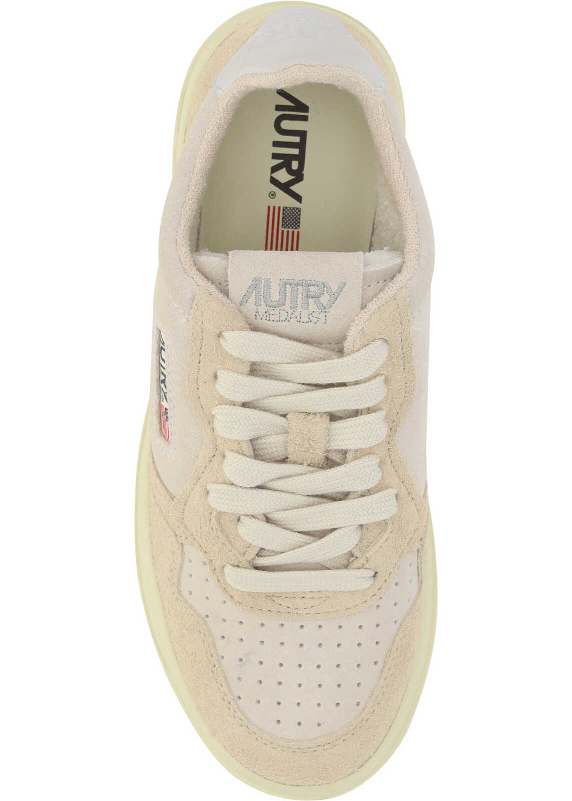 Medalist Low Leather Sneakers from Autry, perforated round toe, perforated front lace-up closure, leather tab with logo patch, iconic press-stamped logo heel at back, iconic signature and brand logo on outer side panel, suede paneled design.