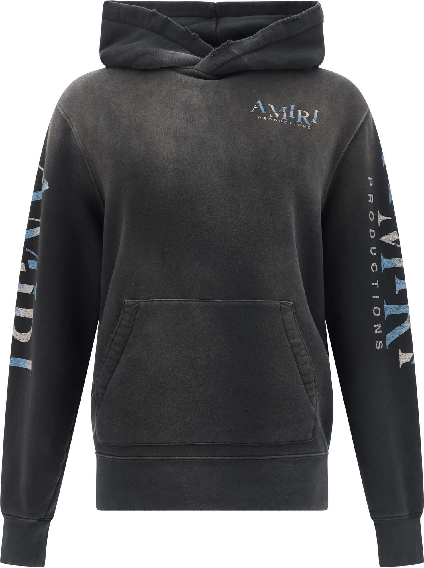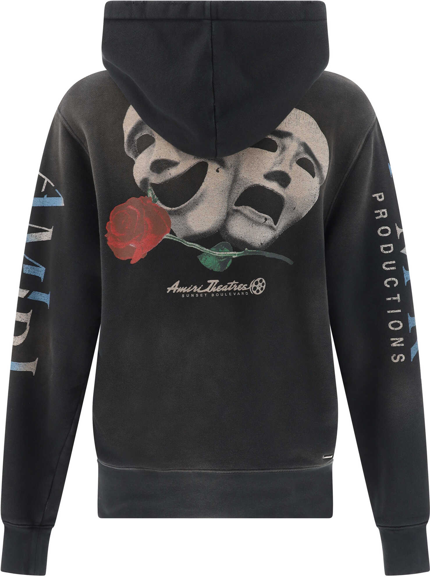 Theatre Masks Cotton Hoodie by Amiri featuring ribbed cuffs, ribbed hem, front kangaroo pocket, iconic brand monogram printed in contrast on front and left sleeve, maxi print with iconic brand monogram detail in contrast on back,vintage worn effect design, regular fit.