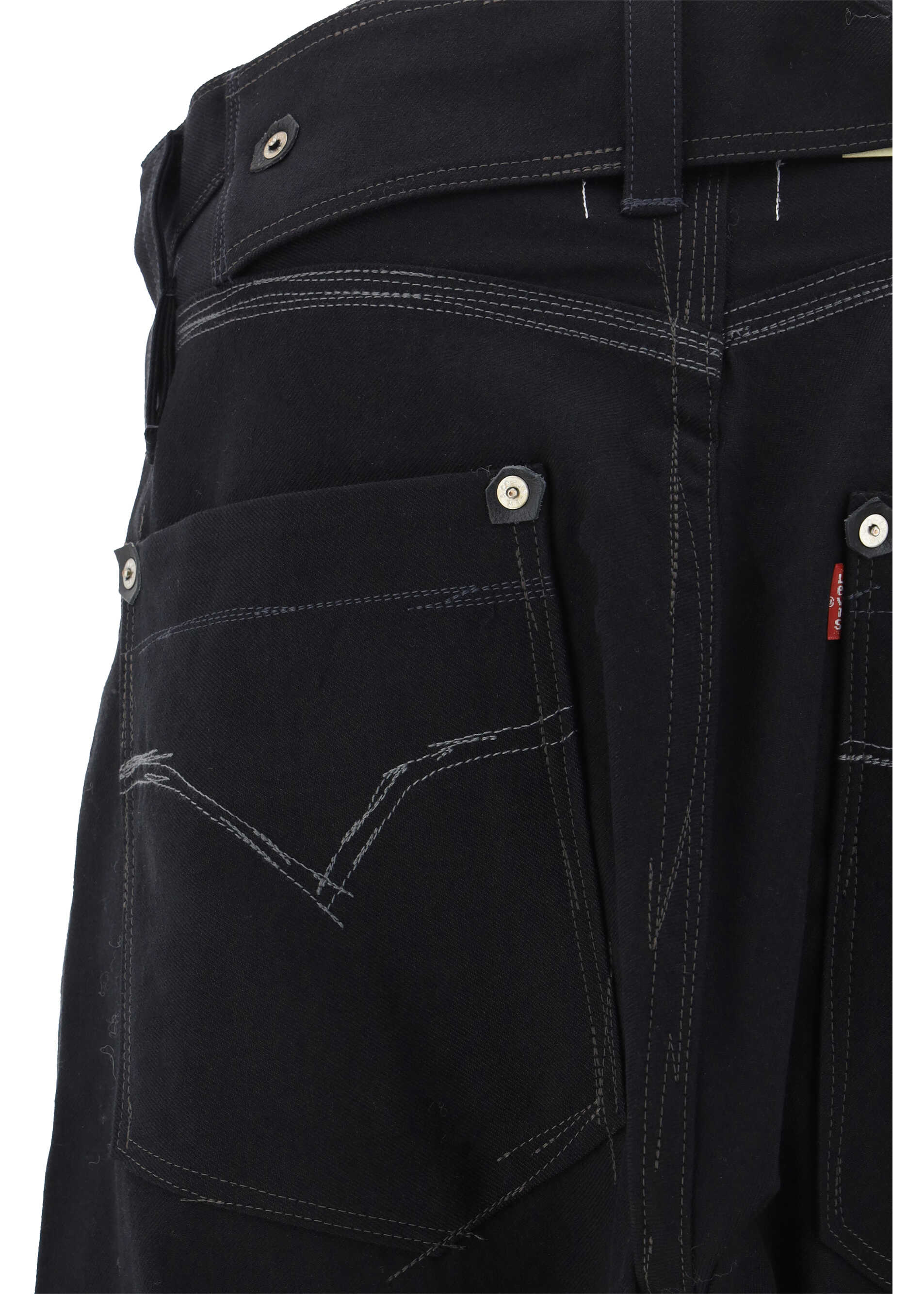 Wool Pants by Junya Watanabe Comme des Garcons x Levis, five-pocket baggy style, front button fastening, waistband loops, iconic branded signature leather patch with press-stamped applique at back, adjustable martingale at back.