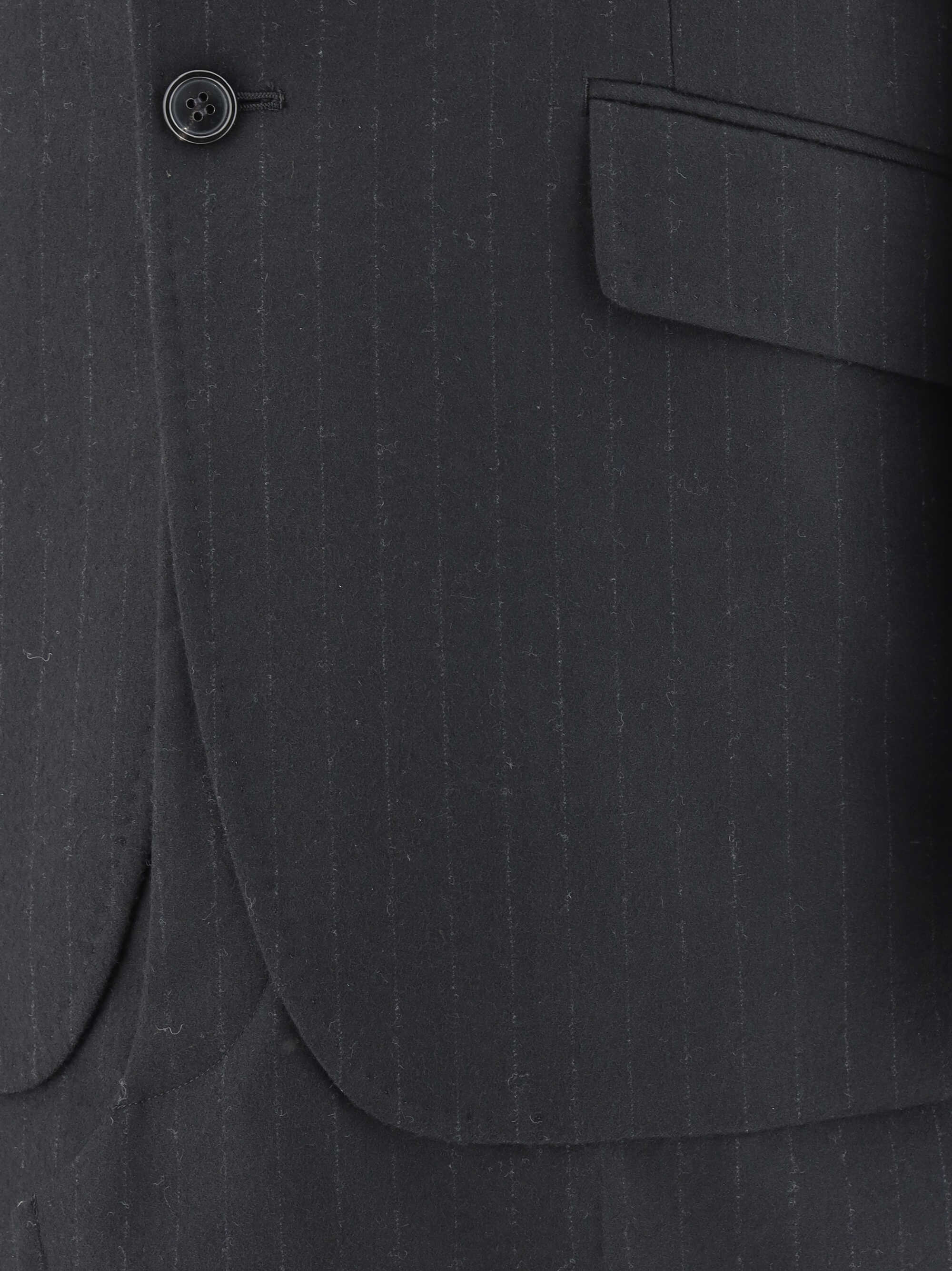Wool Coat by Junya Watanabe x Comme Des Garçons, blazer style, classic lapels, single-breasted front button closure, two welt flap pockets on front, front slit pocket, turned-up hem, pinstripe pattern, regular fit.