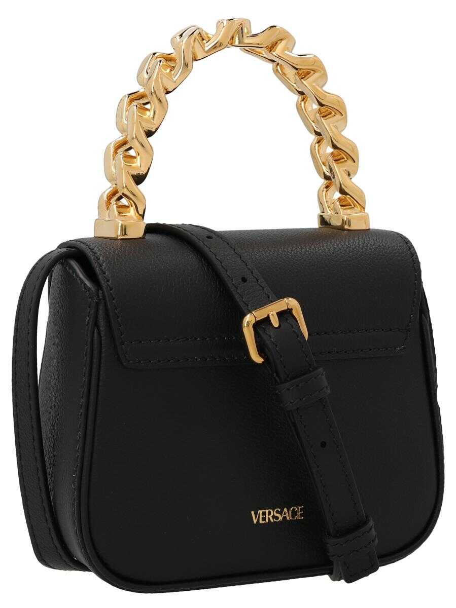 La Medusa' mini handbag made in full-grained leather, central metal logo application, top chain handle, an adjustable and removable shoulder strap, a magnetic flap closure, three inner card compartments