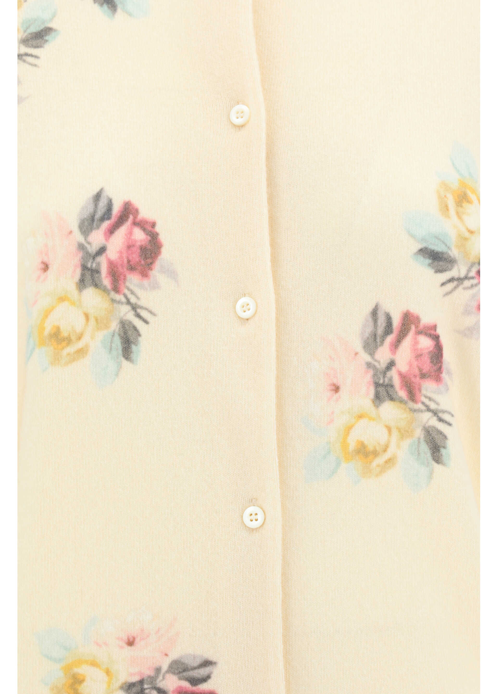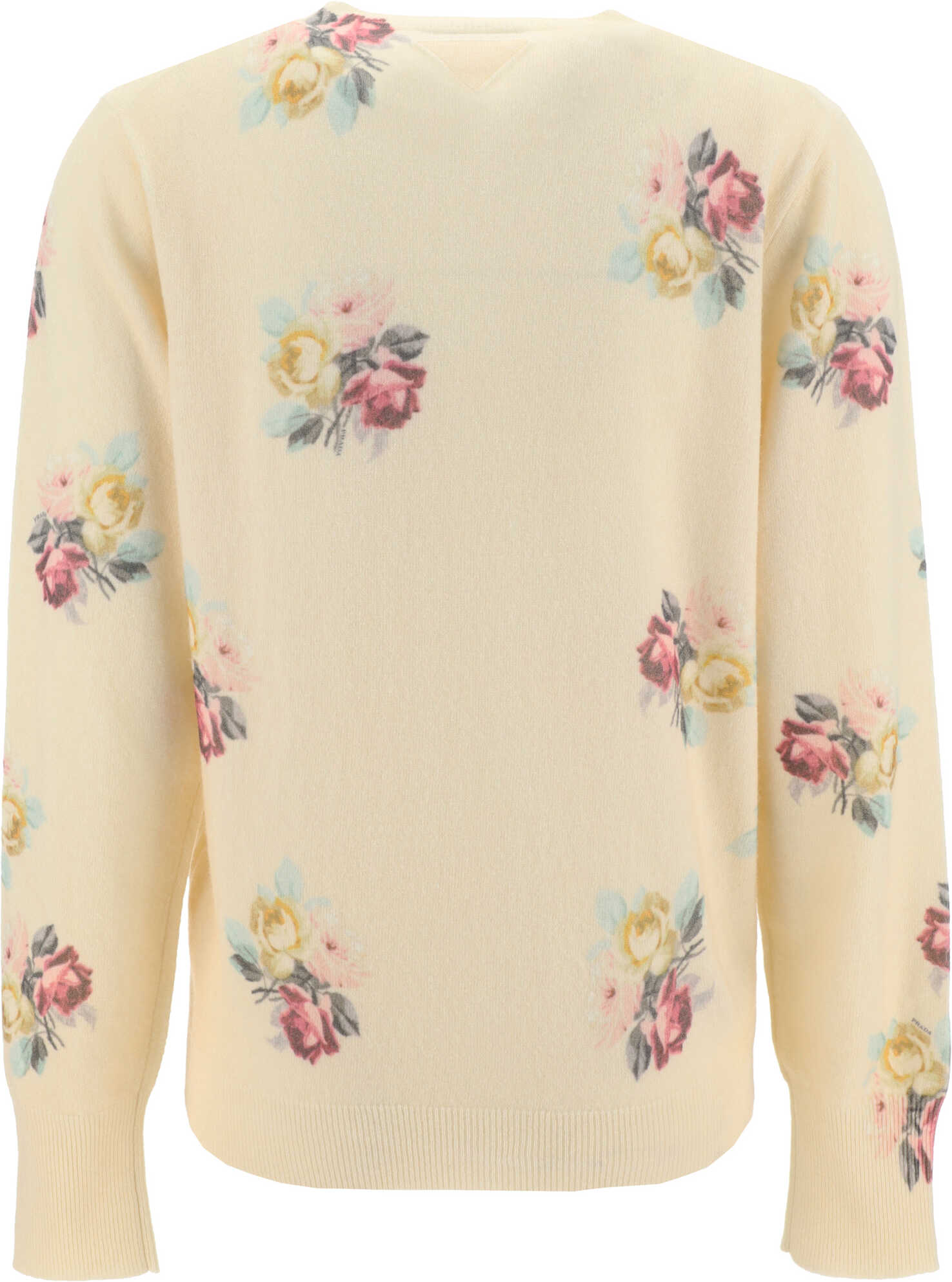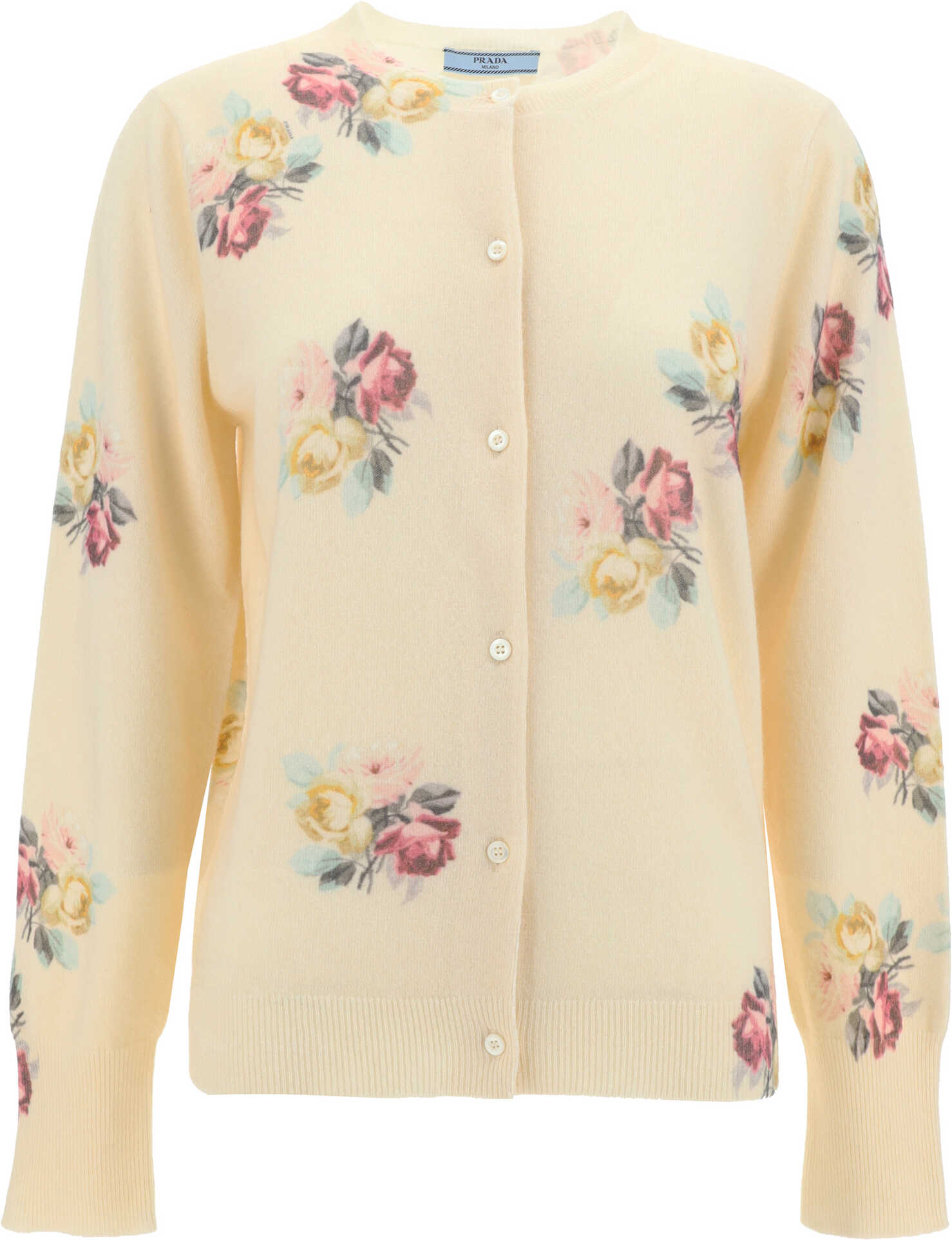 Virgin Wool Cardigan by Prada, ribbed crew neck, button front closure, ribbed neckline, ribbed hem, floral pattern on front and back, regular fit.