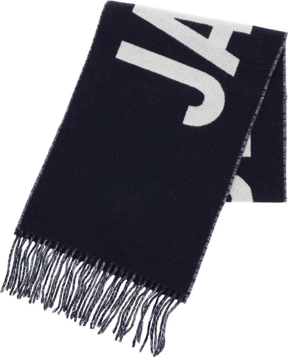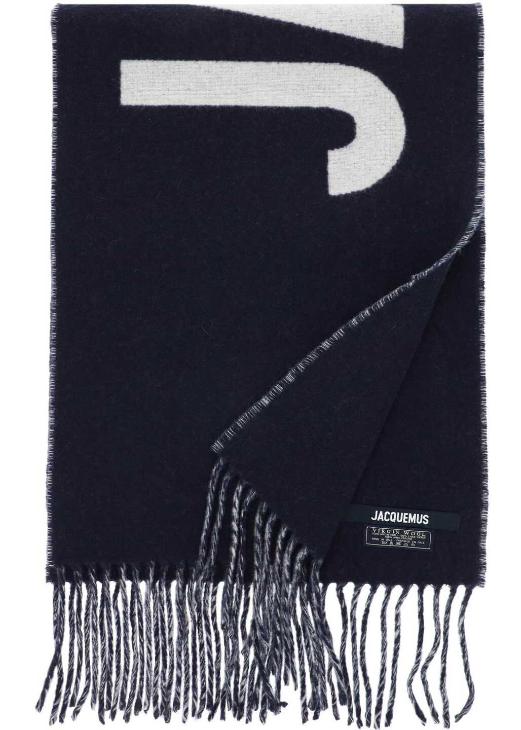 Jacquemus scarf crafted in pure virgin wool fabric with contrasting jacquard maxi logo on one side. Fringed ends.