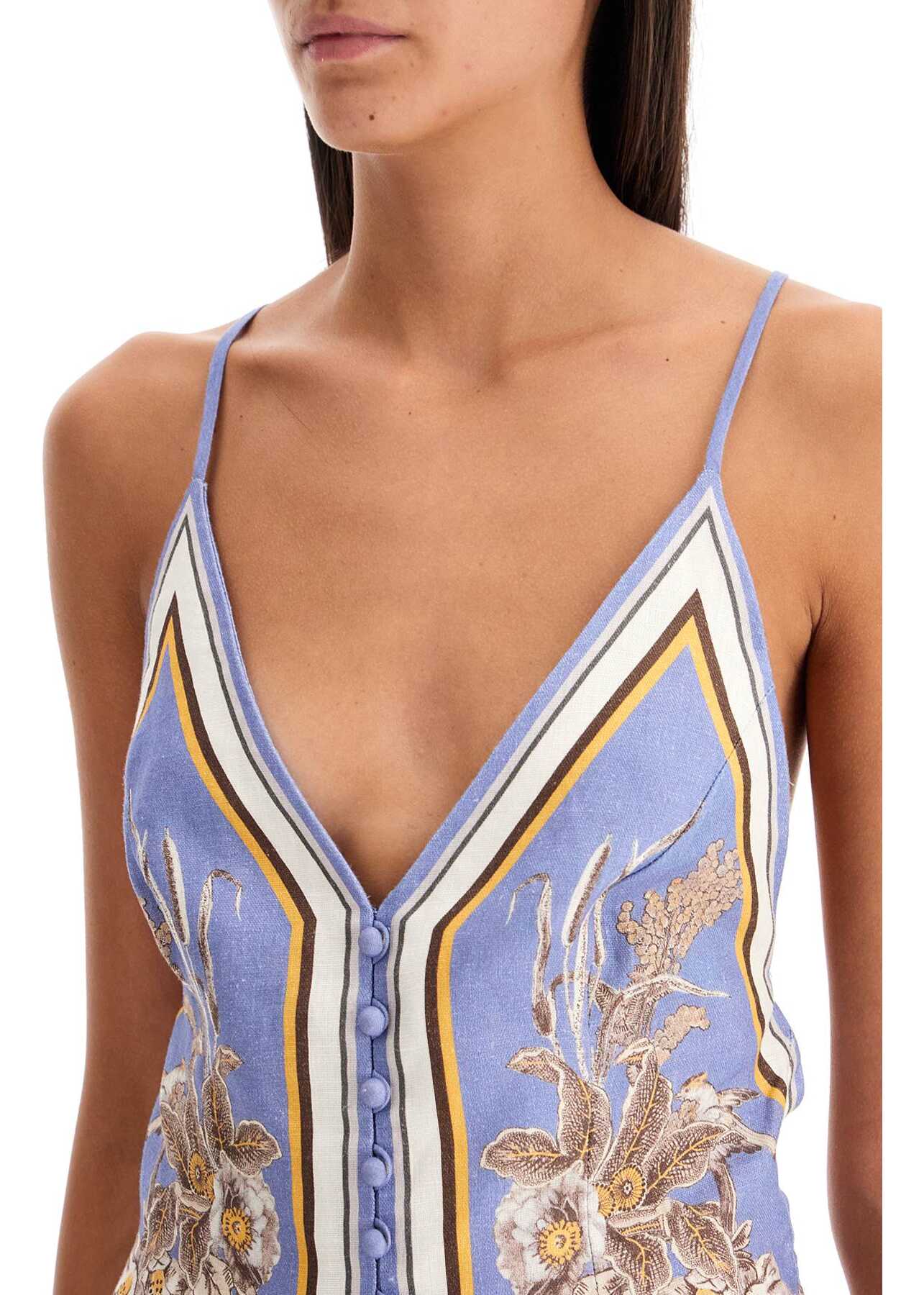 Adorned with floral motifs and striped details, this long Zimmermann dress is made of pure linen with a deep V-neckline and thin criss-cross straps at the back. A row of covered buttons completes the front of the garment. An invisible zipper is located on the back. The model is 177 cm tall and wears size 0.