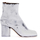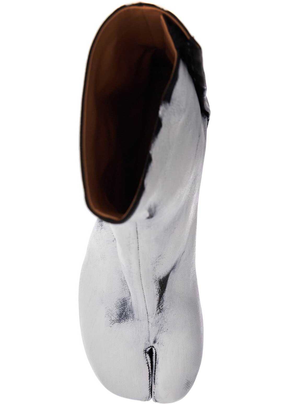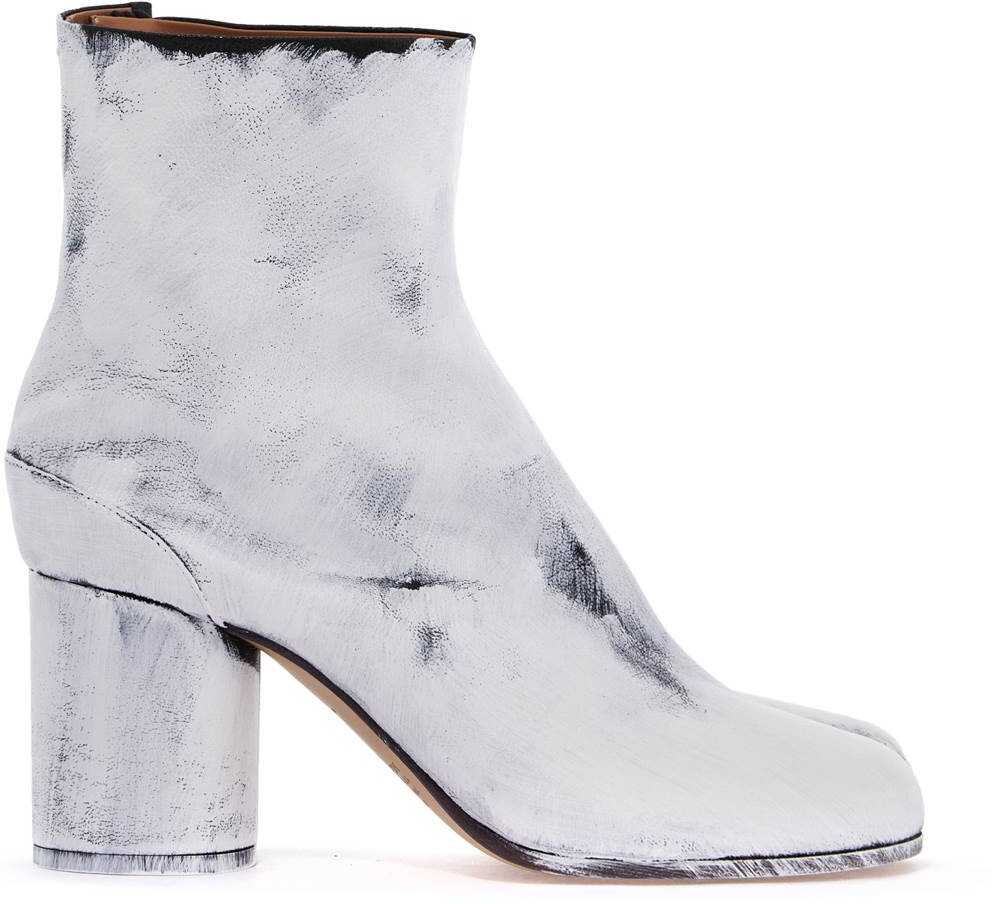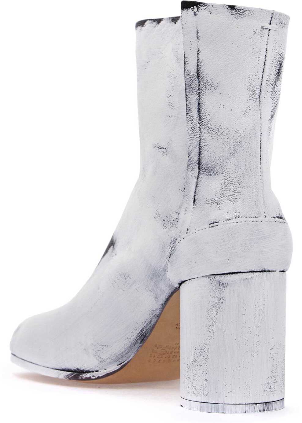Maison Margiela's Tabi ankle boots are crafted from vintage nappa leather and finished with a Bianchetto treatment that changes and fades over time, creating an ever-evolving look. Featuring a cylindrical heel, iconic split toe design, and signature white stitching on the back. The closure is hidden by hooks, while the interior is lined with leather and the sole is made of leather.