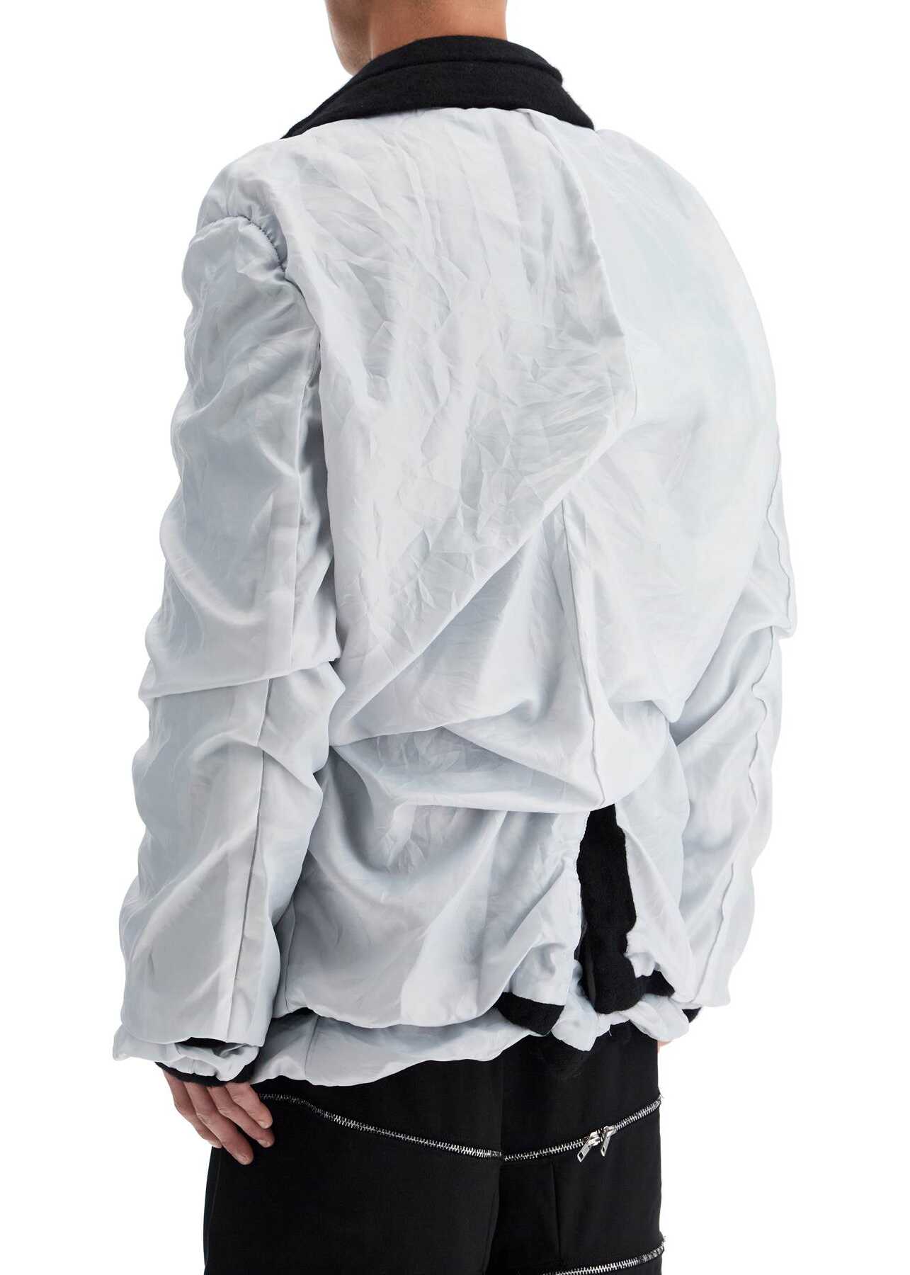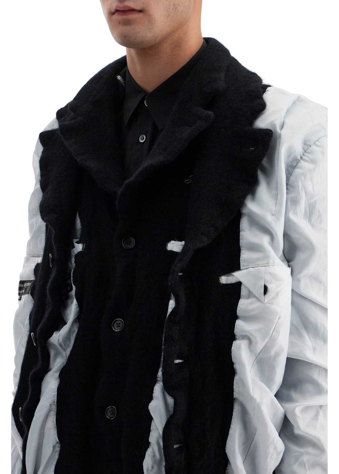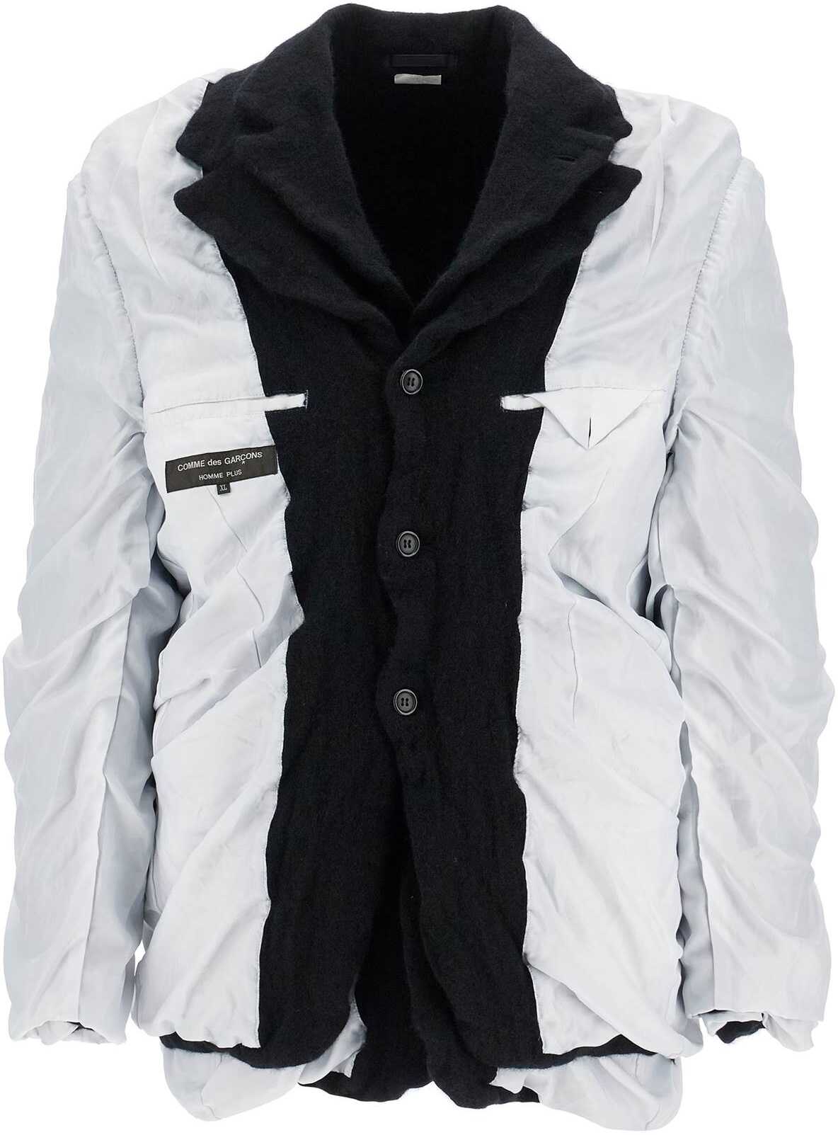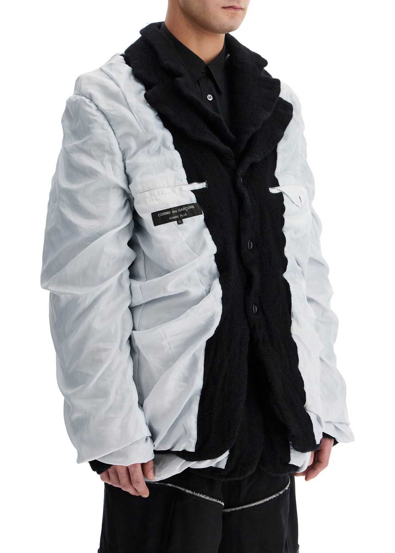 This jacket from the Homme Plus collection by Comme Des Garç ons is made of warm wool blend fabric and features a unique double-layer construction with an inside-out design and visible lining. The single-breasted style has a three-button closure, notched lapels, and flap pockets, one of which has a buttoned flap. It also includes a back center vent for added comfort. With a relaxed fit, this jacket is perfect for any occasion. The model is