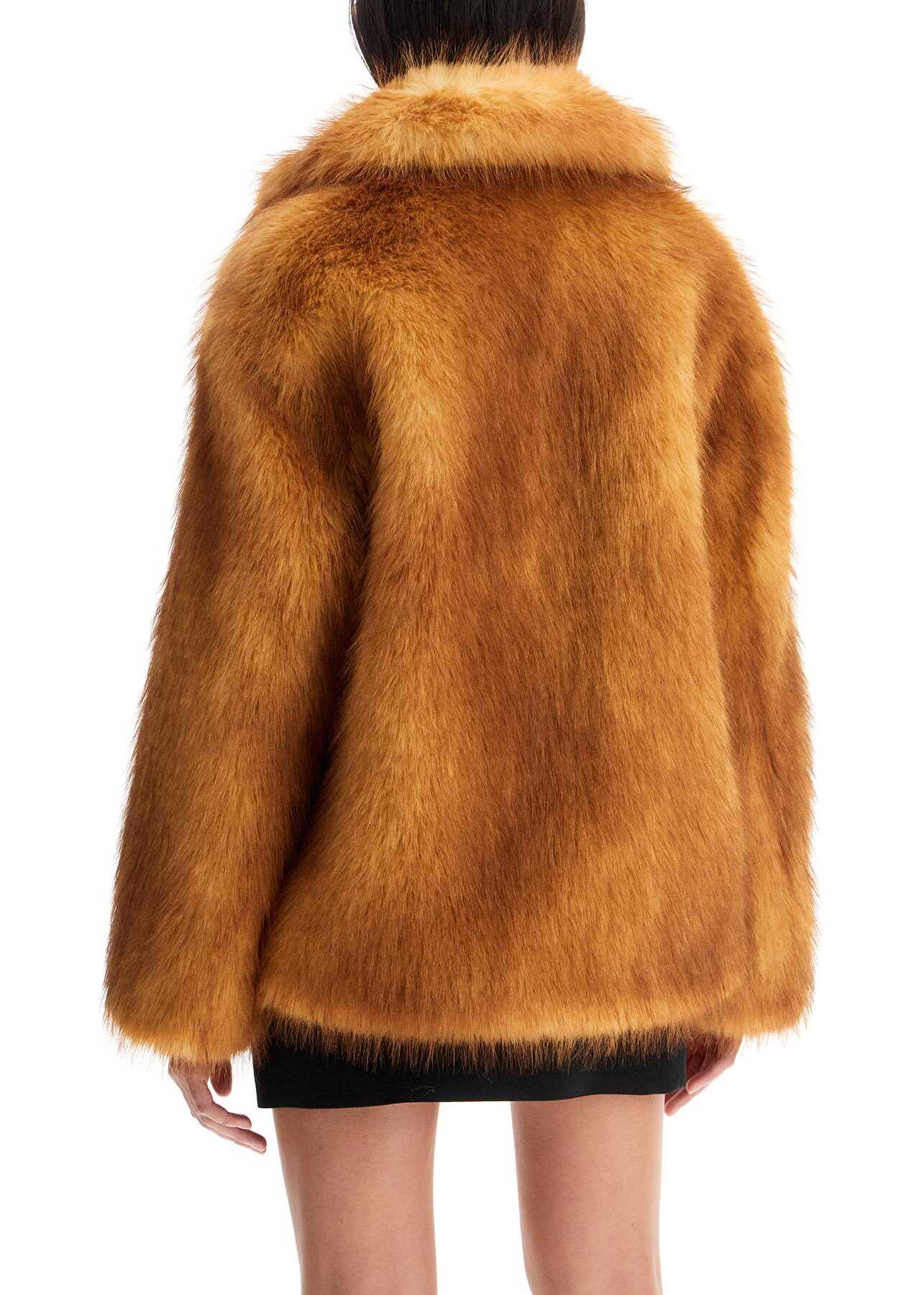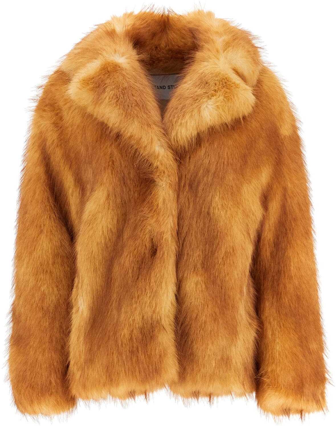 Short Stand Studio coat made of soft synthetic fur with a straight and wide cut. It features a notched collar, side pockets, and hidden hooks closure. Lined interior with a small pocket. The model is 177 cm tall and wears EU size 34.