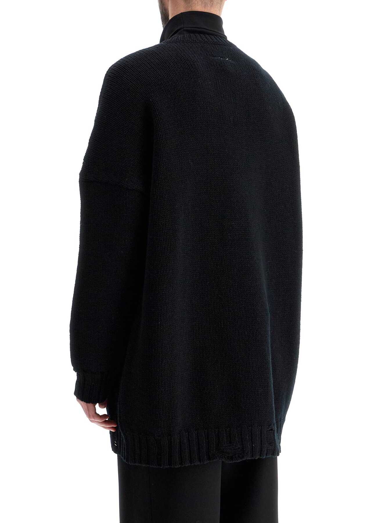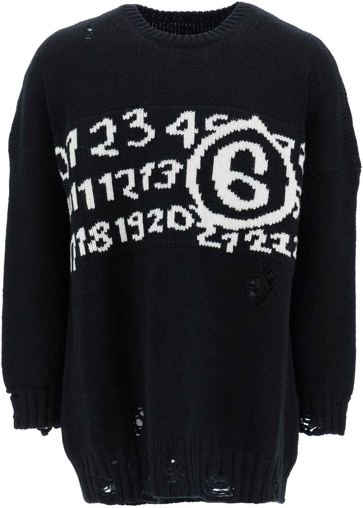 This oversized sweater from the MM6 collection by Maison Margiela is made of pure virgin wool with distressed details and an iconic numerical jacquard graphic on the front. It features ribbed edges for a finished look. The model is 187 cm tall and wears a size M.