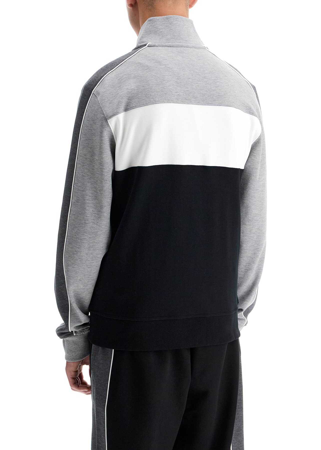 The Eden Park high-neck sweatshirt is made of comfortable interlock jersey in a color block design featuring shades of grey, black, and white. It has a full zip closure and side pockets with zips, and is finished with ribbed cuffs and hem. Regular fit. The model is 182 cm tall and wears size M.