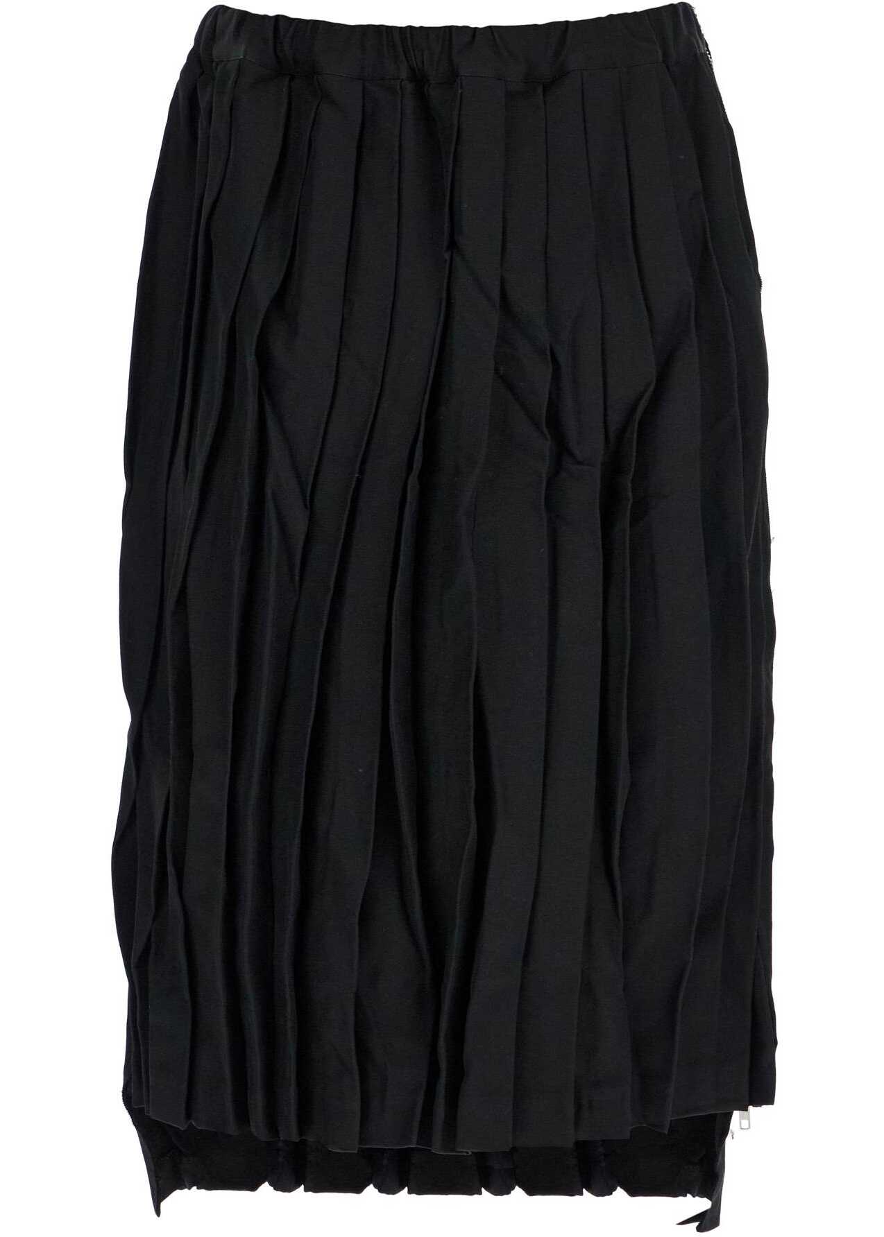 This midi skirt from the Black line by Comme Des Garçons is made of technical gabardine with a pleated design that creates a crinkled effect. It features zip openings along the sides and an adjustable elastic waistband with an internal drawstring. The skirt is finished with an asymmetrical hemline. The model is 182 cm tall and wears a size M.
