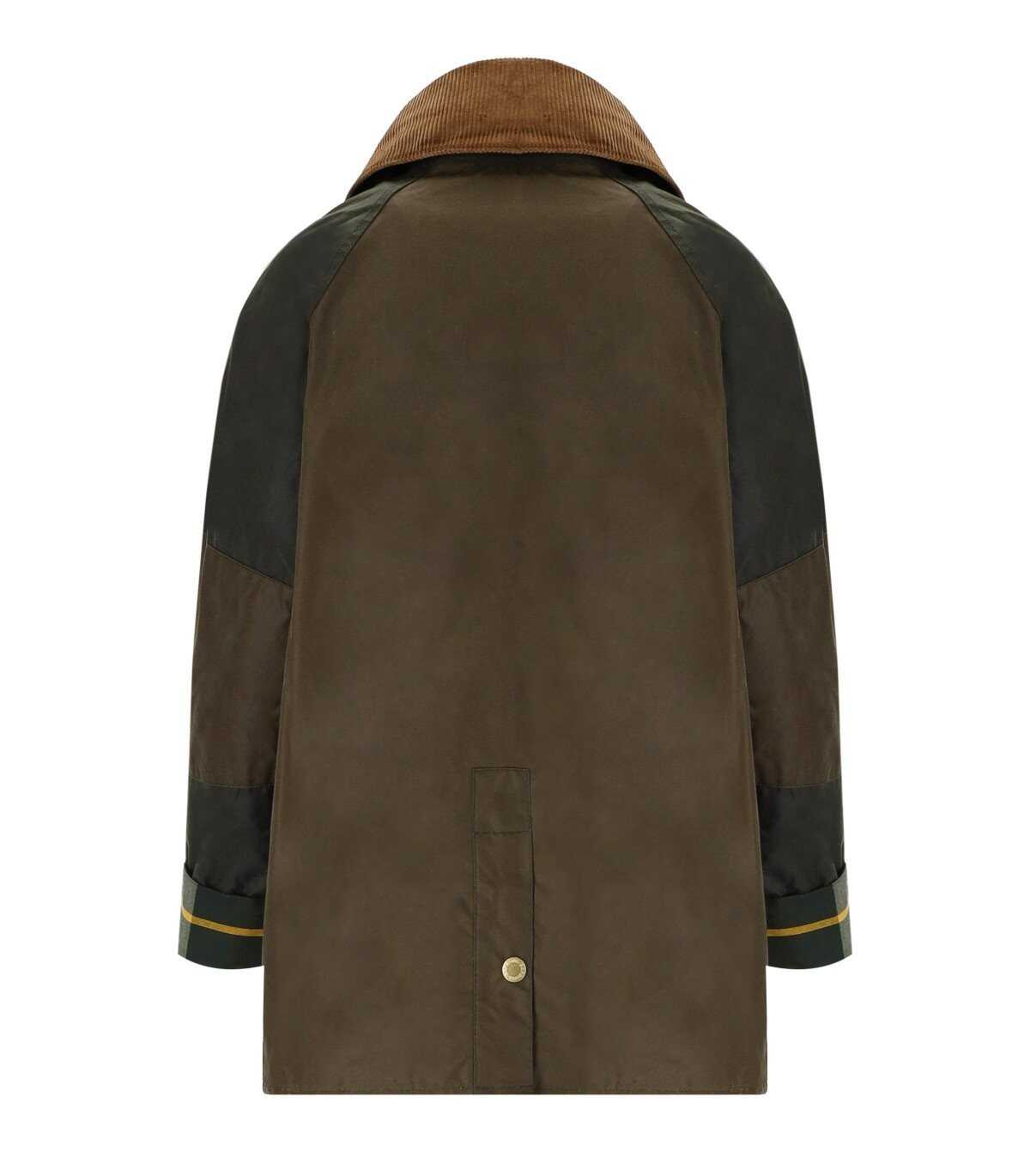 Barbour Allerston Wax jacket made of waxed cotton in olive green. Characterized by a large ribbed collar in brown, it features a front zip closure with an oversized reinterpreted logo. Equipped with two flap pockets and two pockets finished with golden buttons, it has cuffs in a tartan pattern. Oversized fit.