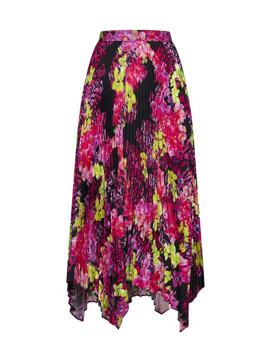 Black, pink and green skirt from Versace featuring abstract pattern print, plissé effect, high-waisted and handkerchief hem.