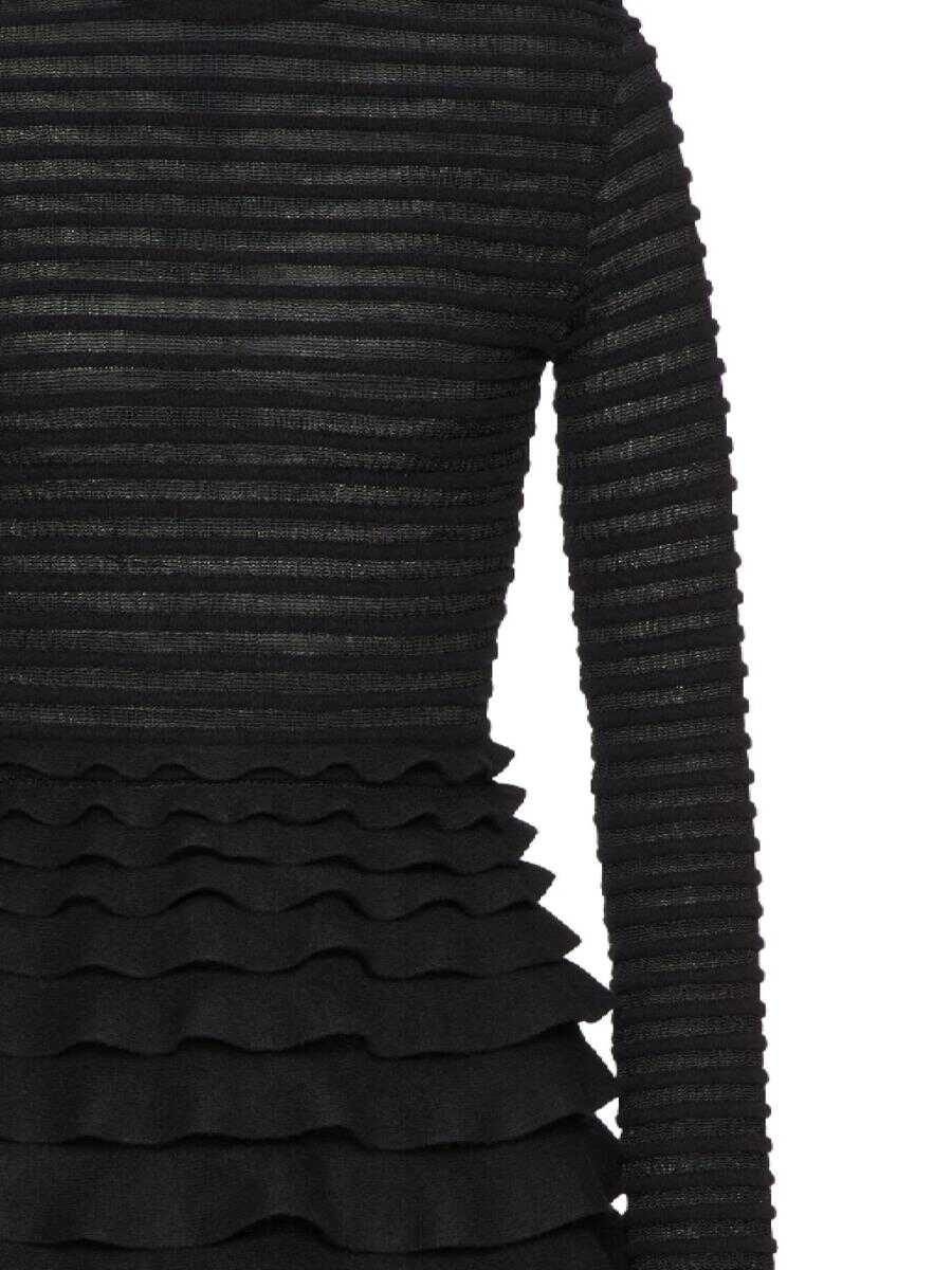 black ribbed detailing tiered skirt round neck long sleeves straight hem concealed rear zip fastening full lining