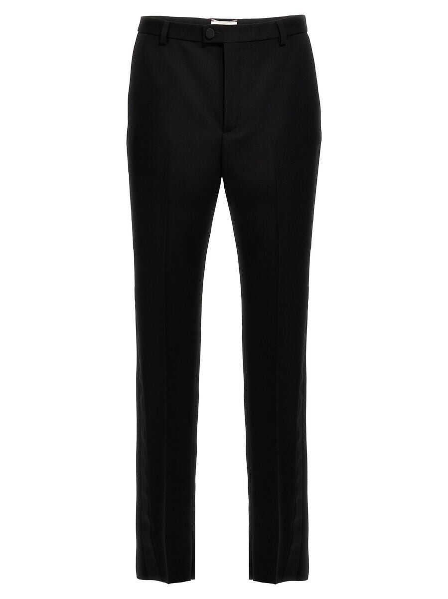Saint Laurent's high-waisted tuxedo pants crafted in black wool grain de poudre with satin bands along sides. Featuring hook-and-eye / button / zip closure, belt loops, multiple pockets and pressed crease along centre. Partially lined interior.