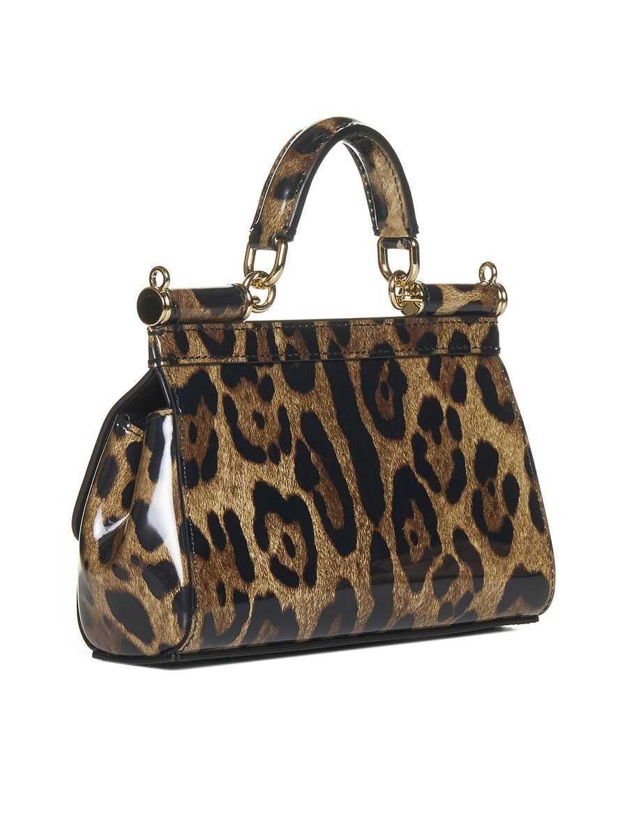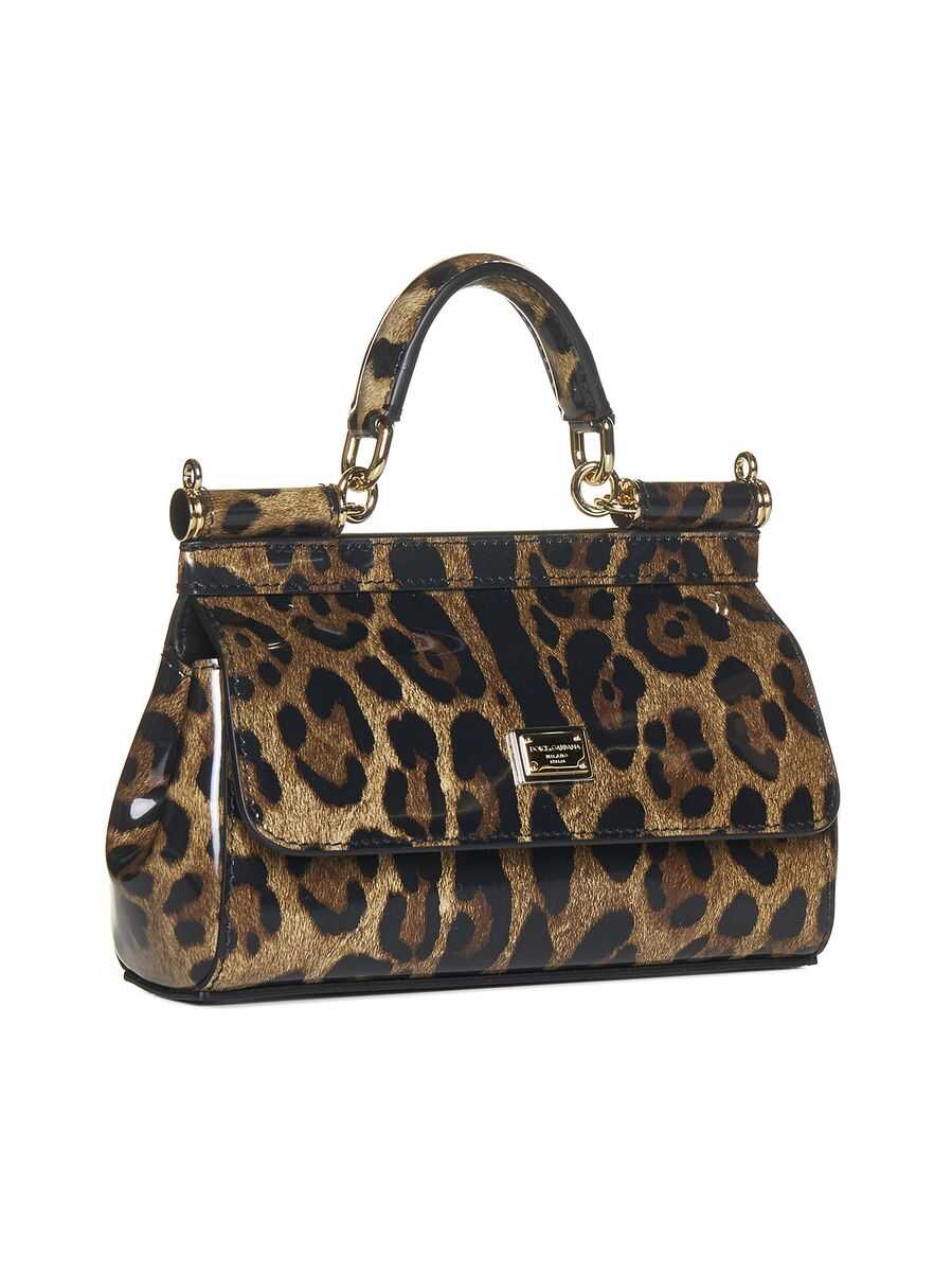 Dolce & Gabbana x Kim Kardashian's Sicily Kim small bag in leopard print glossy leather featuring an adjustable and detachable thin shoulder strap, a top handle, flap with central logo plaque, concealed magnetic fastening, black leather lining, an inner flat pocket and gold-tone metal hardware.