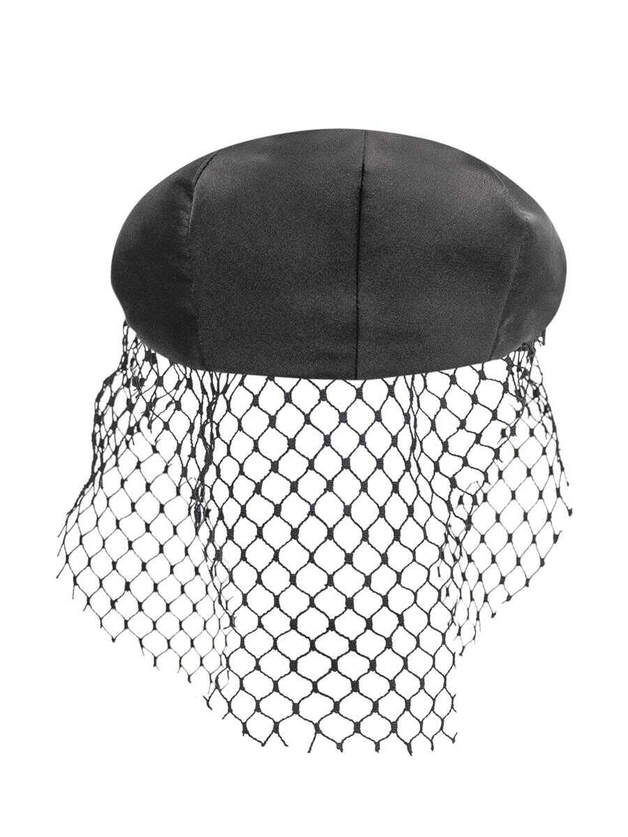 Silk satin cap with visor. Silk satin inner lining. Internally applied logo. Applied lace fabric flap.