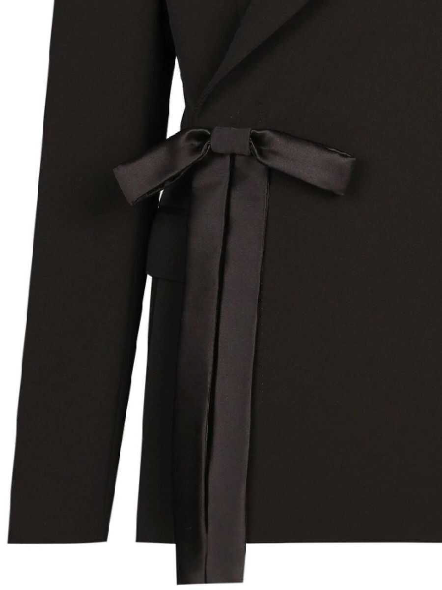 Black bow detailing peak lapels side tie fastening long sleeves chest welt pocket two side flap pockets English rear vents