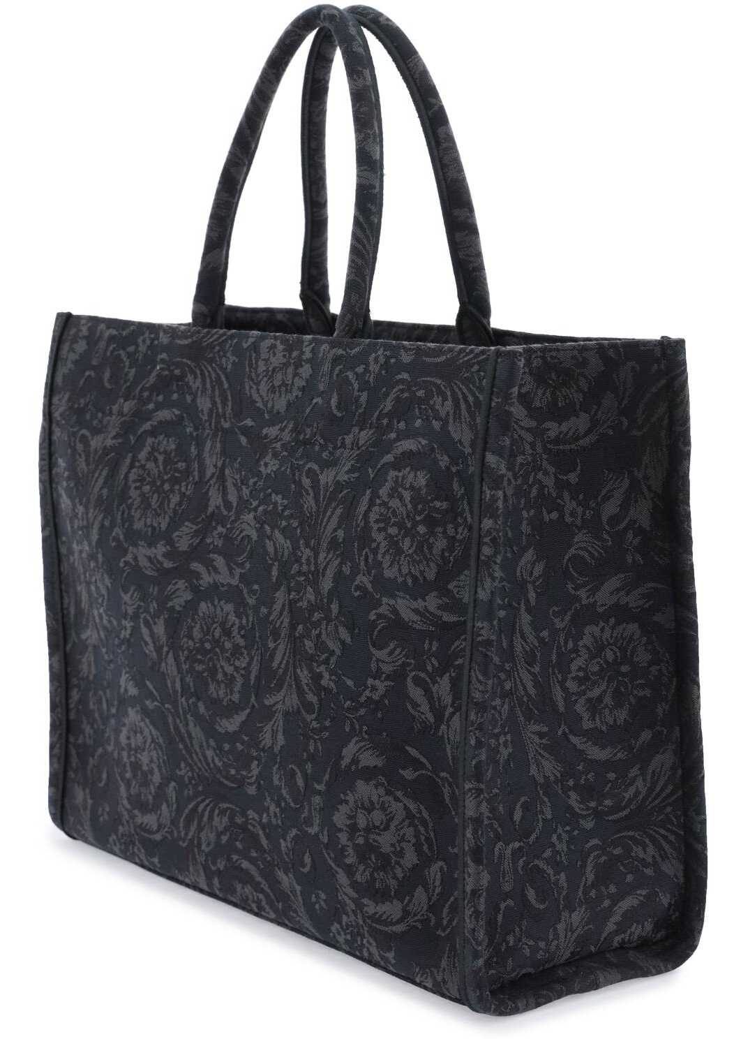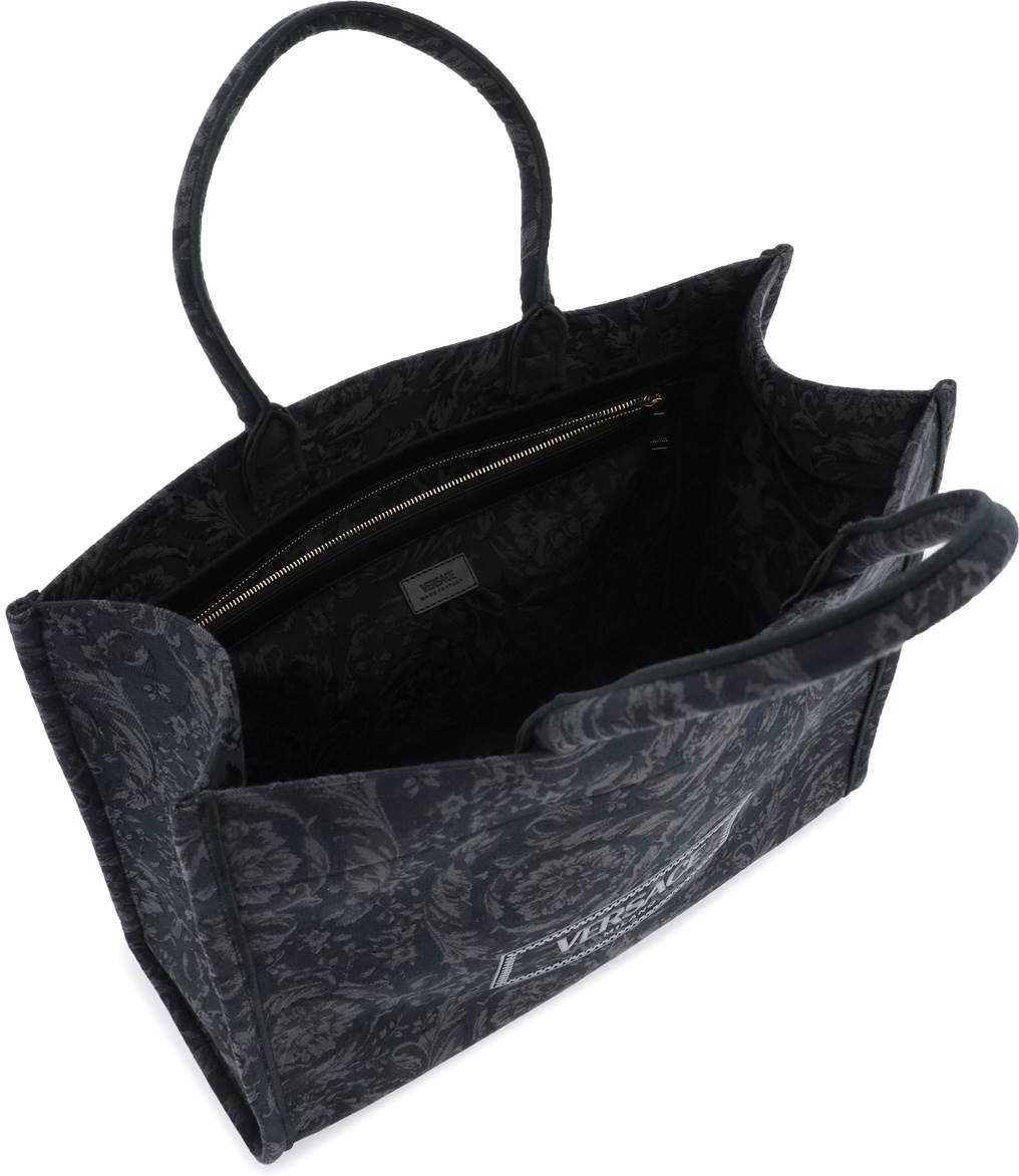 Athena Barocco large tote bag by Versace is crafted in jacquard Barocco cotton-blend canvas with contrasting '90s Vintage Logo embroidery. It features a double-handle design with open top and an internal zip pocket. Lined interior.