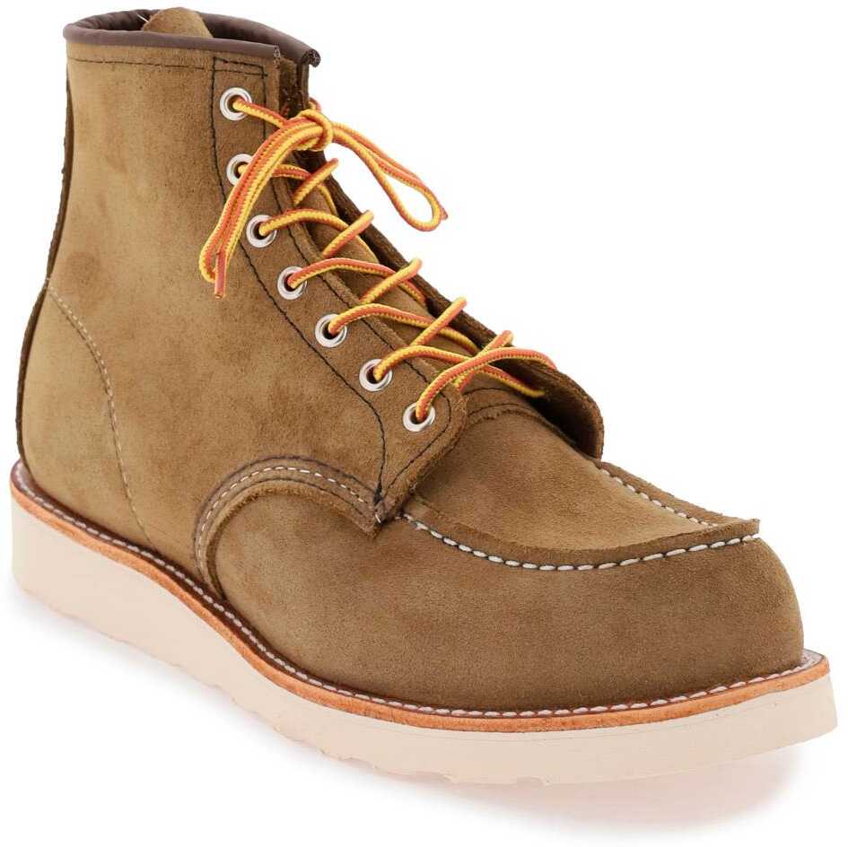Red Wing Classic Moc Toe ankle boots in water-repellent Roughout suede leather, featuring iconic Moc toe and Traction Tred rubber sole. Goodyear construction, contrasting stitching, trekking laces, silver-tone metal eyelets, unlined interior with leather insole.
