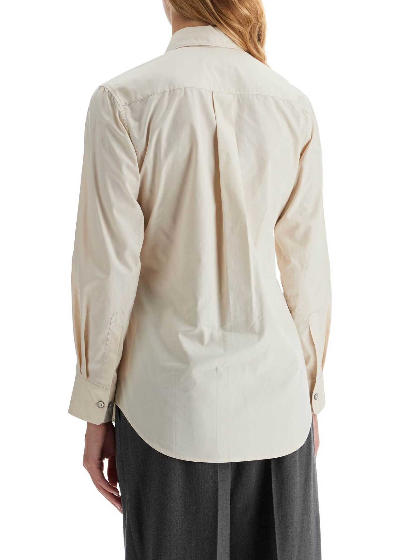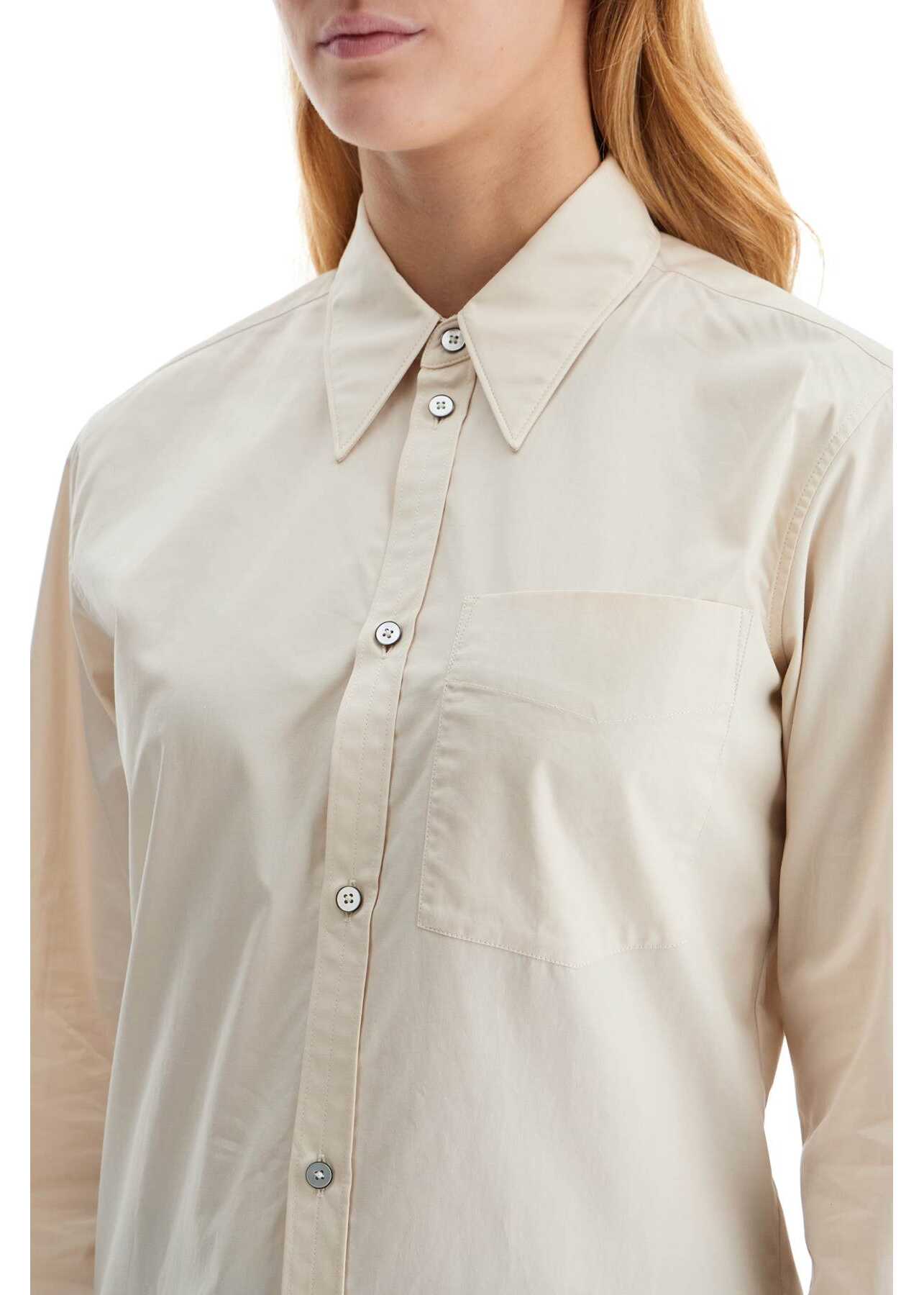 This Lemaire long-sleeved shirt is made of pure cotton poplin with a slim fit and an American-style button closure with mother-of-pearl buttons. It features a chest pocket, adjustable rounded cuffs, a back yoke with a pleat, and a rounded hem. The model is 177 cm tall and wears size FR 43.