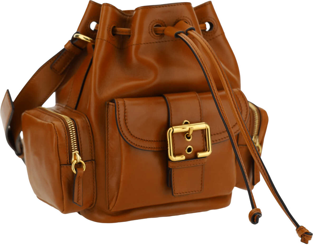 Leather Camera Bucket Bag by Chloé, adjustable shoulder strap, drawstring closure at top, single interior compartment, two zippered lap pockets applied to side panels, one flap pocket and buckle closure applied to front.