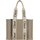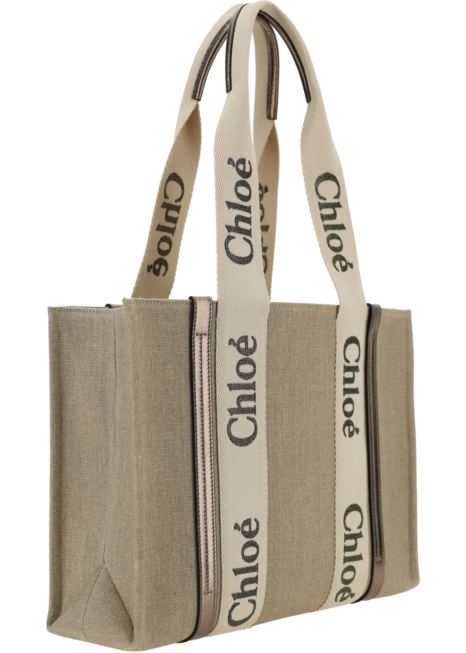 Linen Woody Shoulder Bag by Chloé, featuring double flat handles with contrasting leather side panel extensions, interior welt pocket, leather details, single interior compartment.