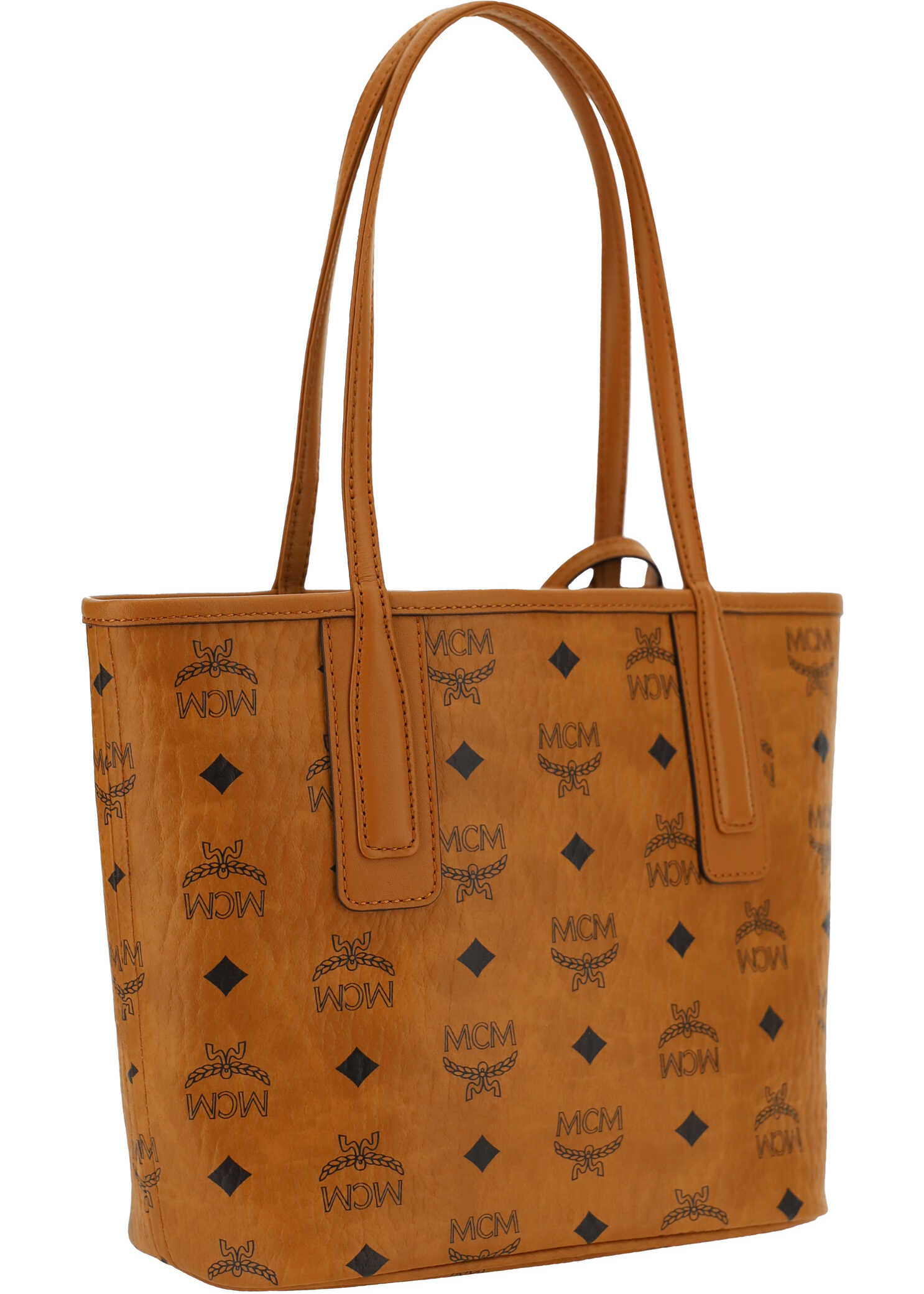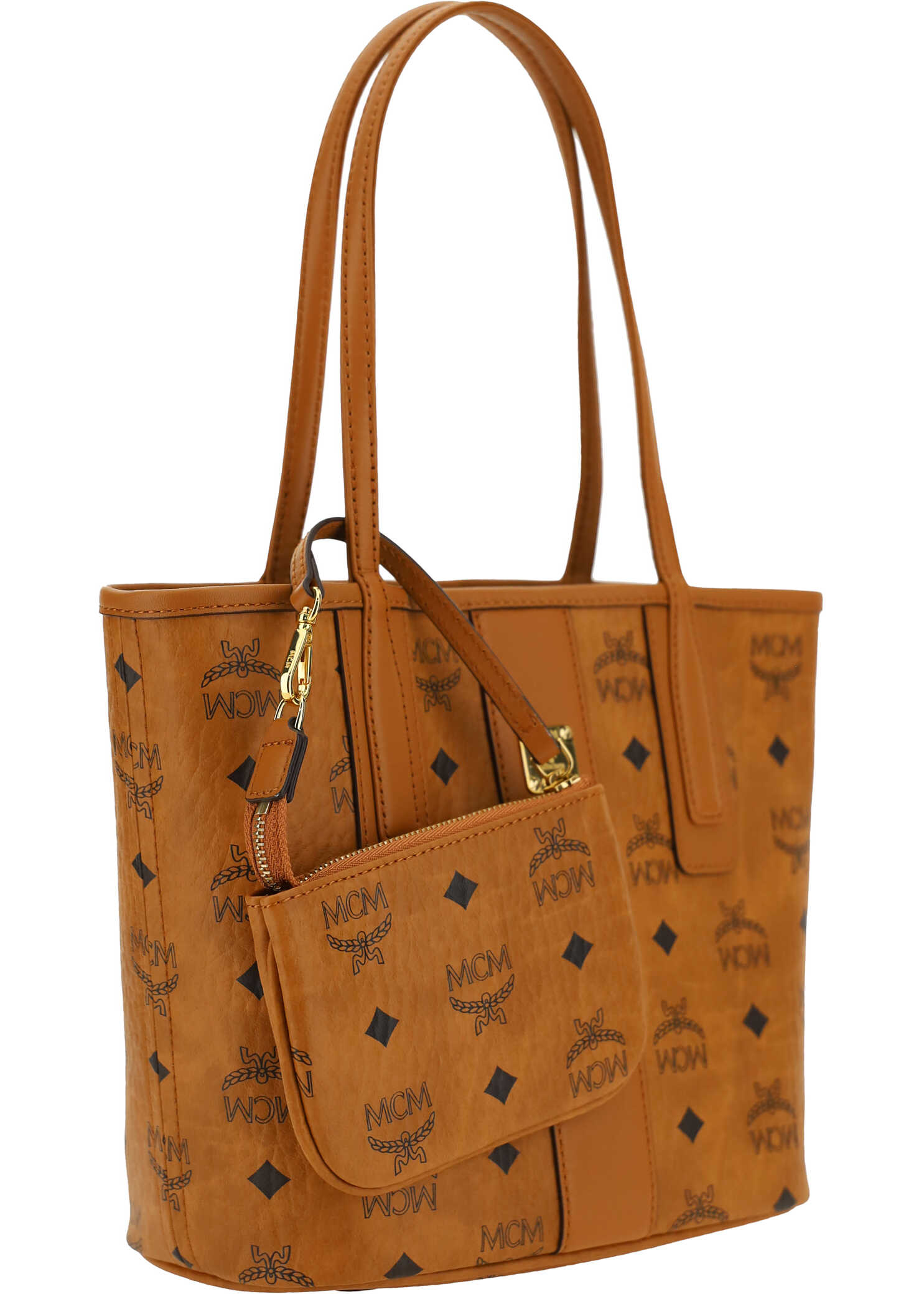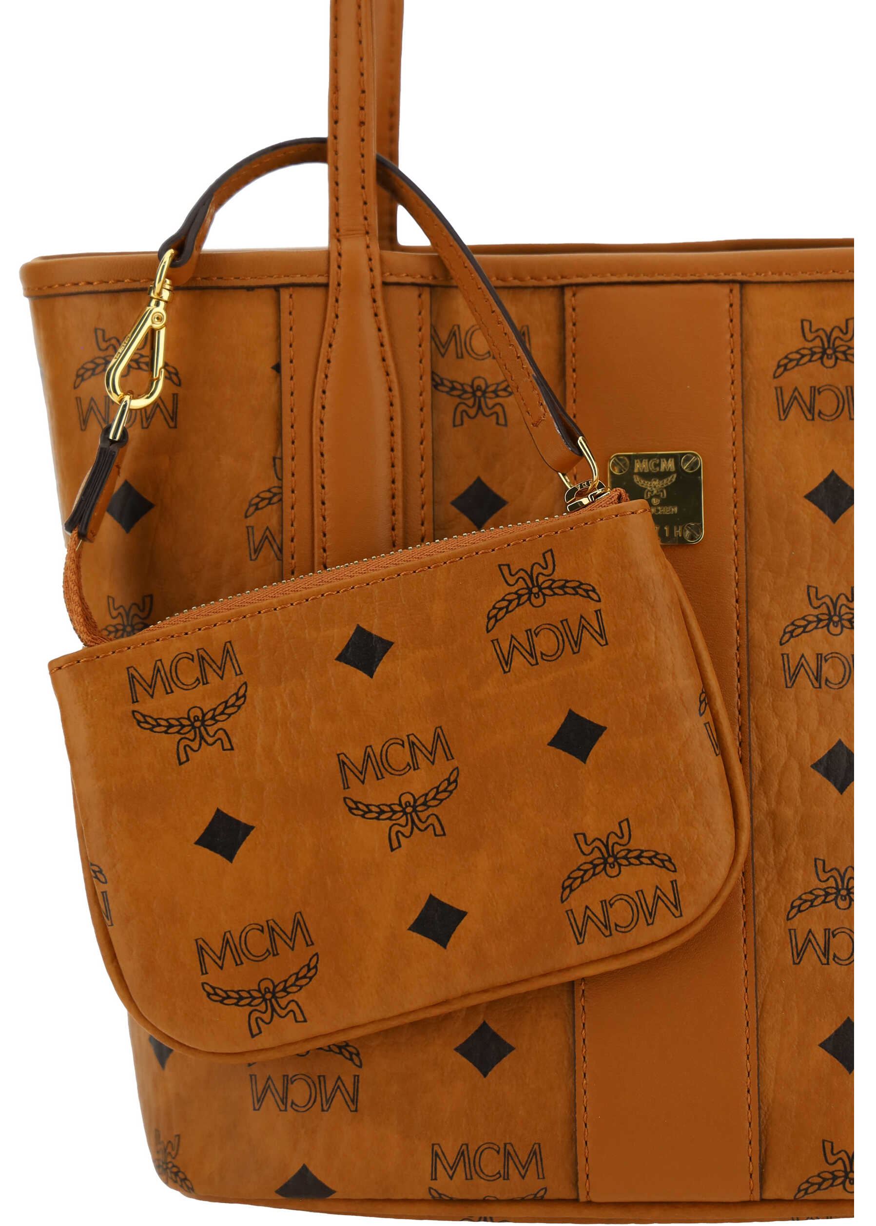 Liz Handbag by MCM, two flat top handles, magnetic button closure, gold plaque on iconic brand logo applied on front, mini pouch with integrated zipper, iconic brand logo printed all-over.