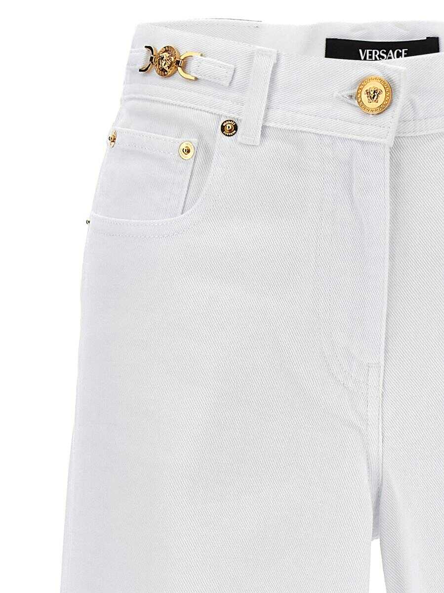 Cotton denim jeans with Medusa '95 details at the waist, zip and button closure, five pockets, leather logo tag, wide flared leg