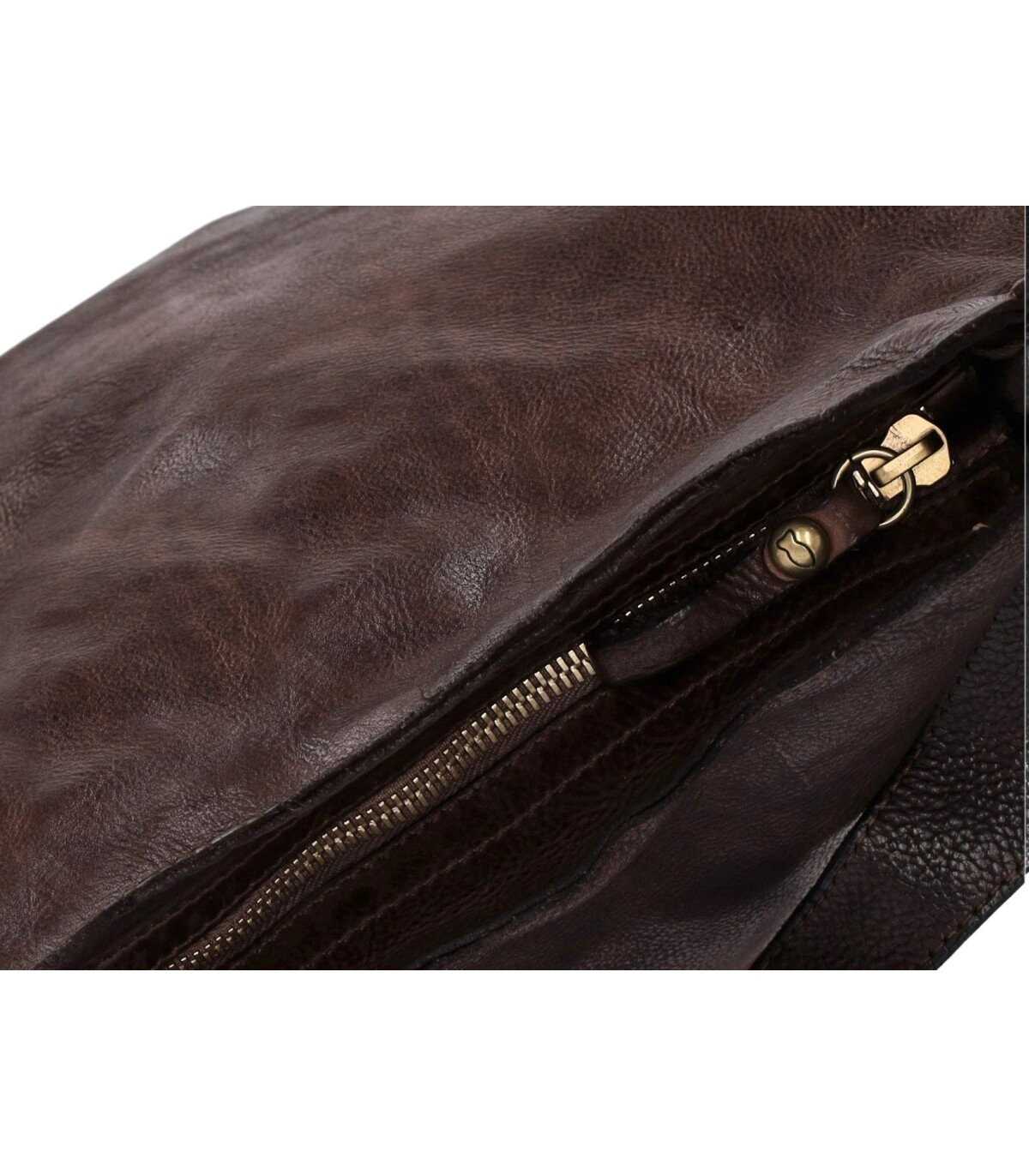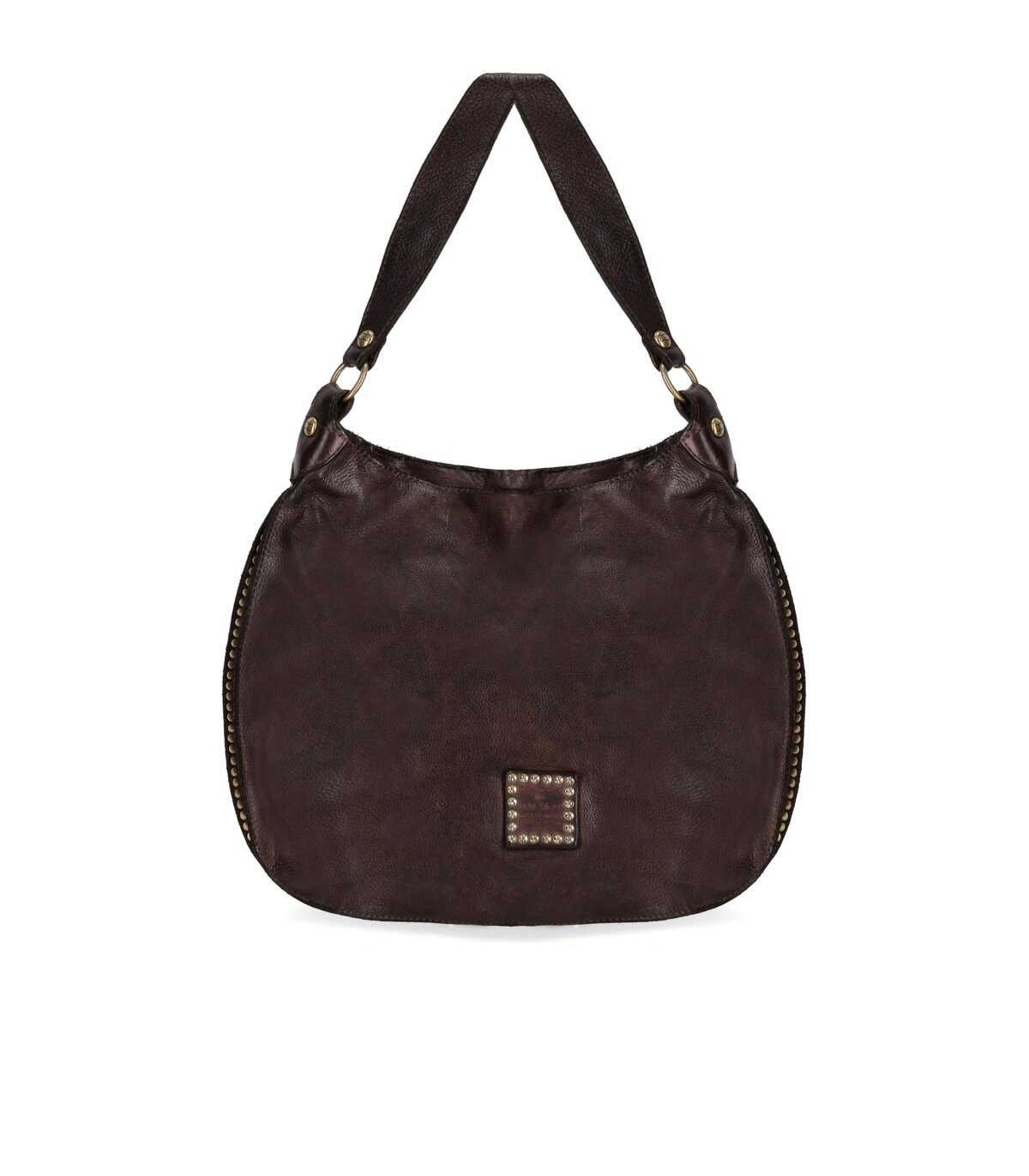 Campomaggi Kura shopping bag made of washed cowhide leather with studs, in dark brown color. Characterized by a zip closure finished in golden metal, it is adorned with a typical Campomaggi stud embellished with rivets. Equipped with a single handle, it has an internal compartment with a zip pocket. It features an internal pocket for a mobile phone and an adjustable shoulder strap. Measurements 37x8x34 cm.