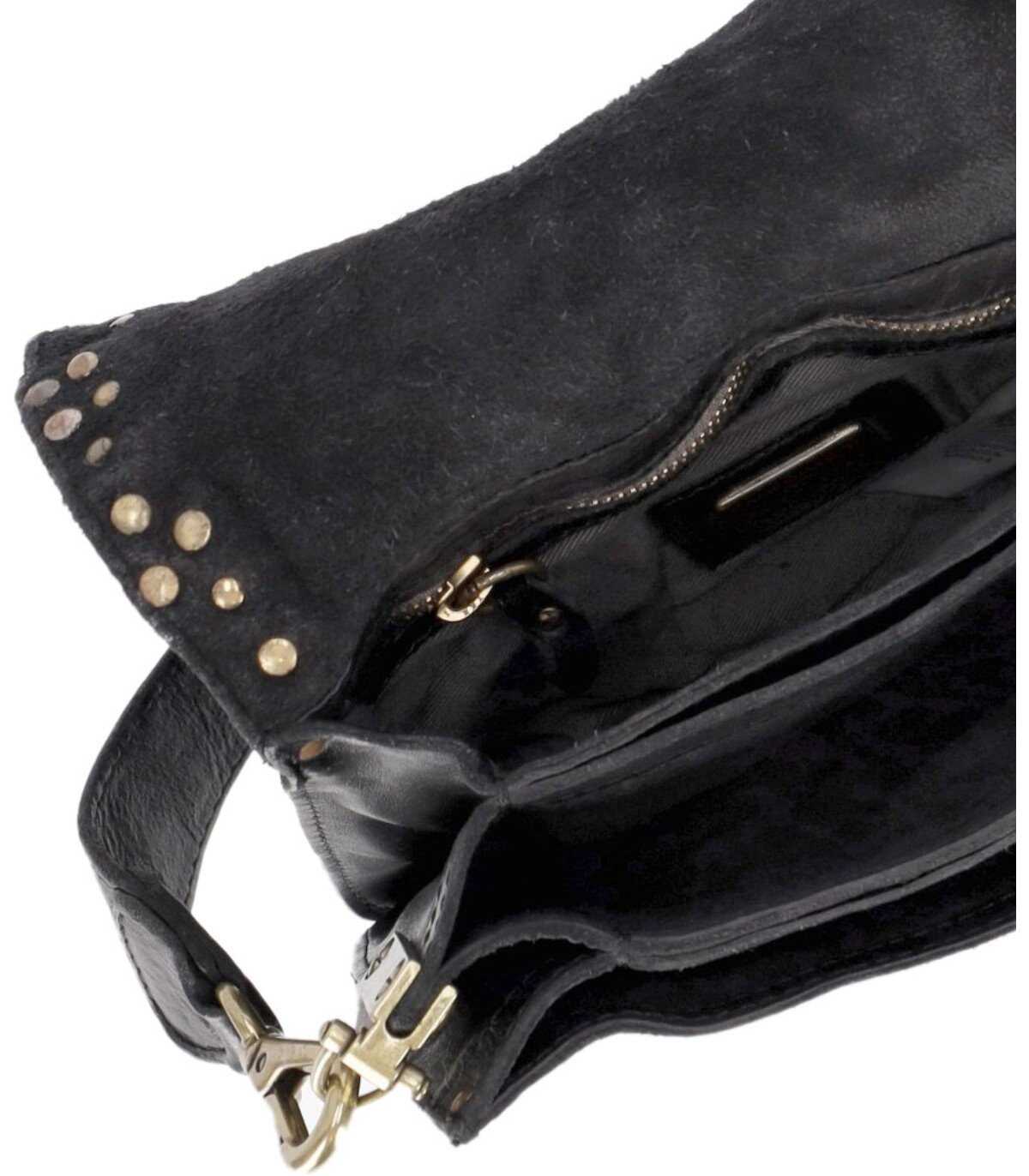 Shoulder bag from the Bella di Notte collection by Campomaggi made of leather in black. Characterized by a turn-lock closure, it is adorned with a combination of studs and rhinestones that light up the front. Equipped with a removable handle, it has an adjustable shoulder strap. Features an internal zip pocket. Measurements 23x7x17 cm.