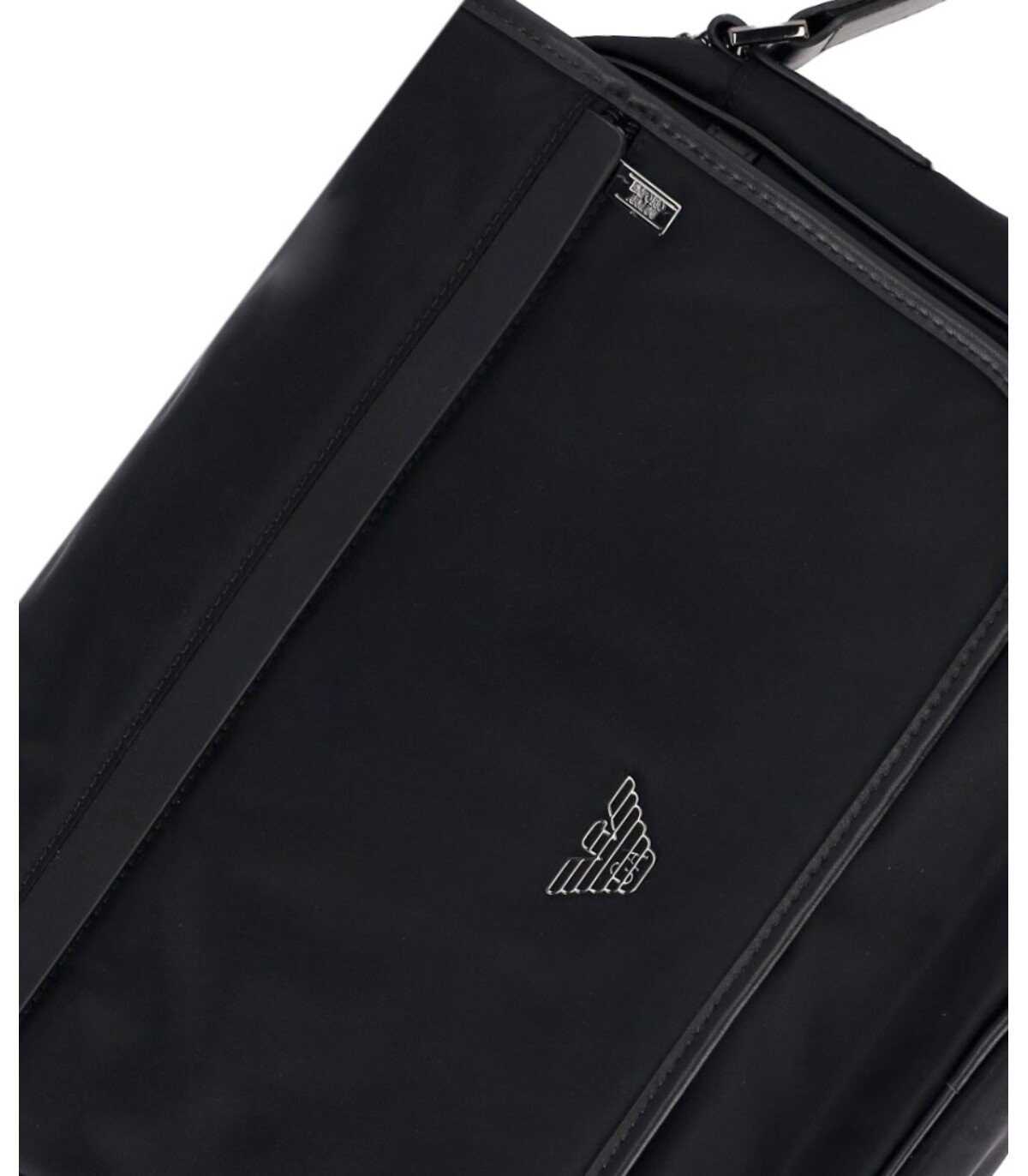 Emporio Armani Messenger shoulder bag made of black technical fabric with saffiano print. Characterized by silver metal details, it features a front logo and two compartments with magnetic and zip closures. Adjustable and removable shoulder strap in branded fabric. Equipped with an internal lining, having a protected compartment for a laptop. Measurements 33x24x9 cm.