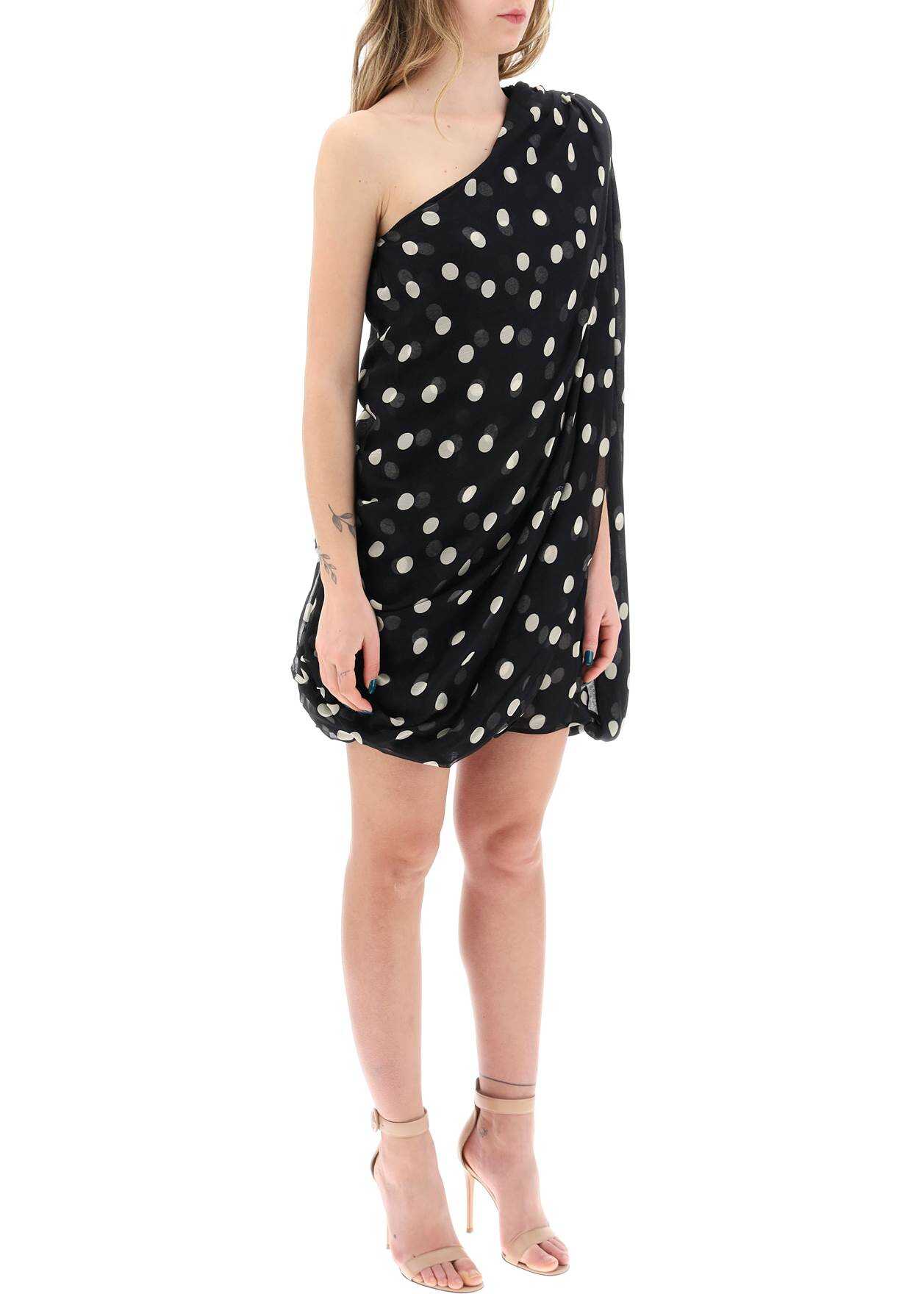 This one-shoulder mini dress by Stella McCartney is made of pure silk chiffon with polka dots. The draped construction highlights the asymmetrical design and airy silhouette of the garment, which falls on the left side in a cape-like effect. An invisible zipper is located on the side for easy wear.
