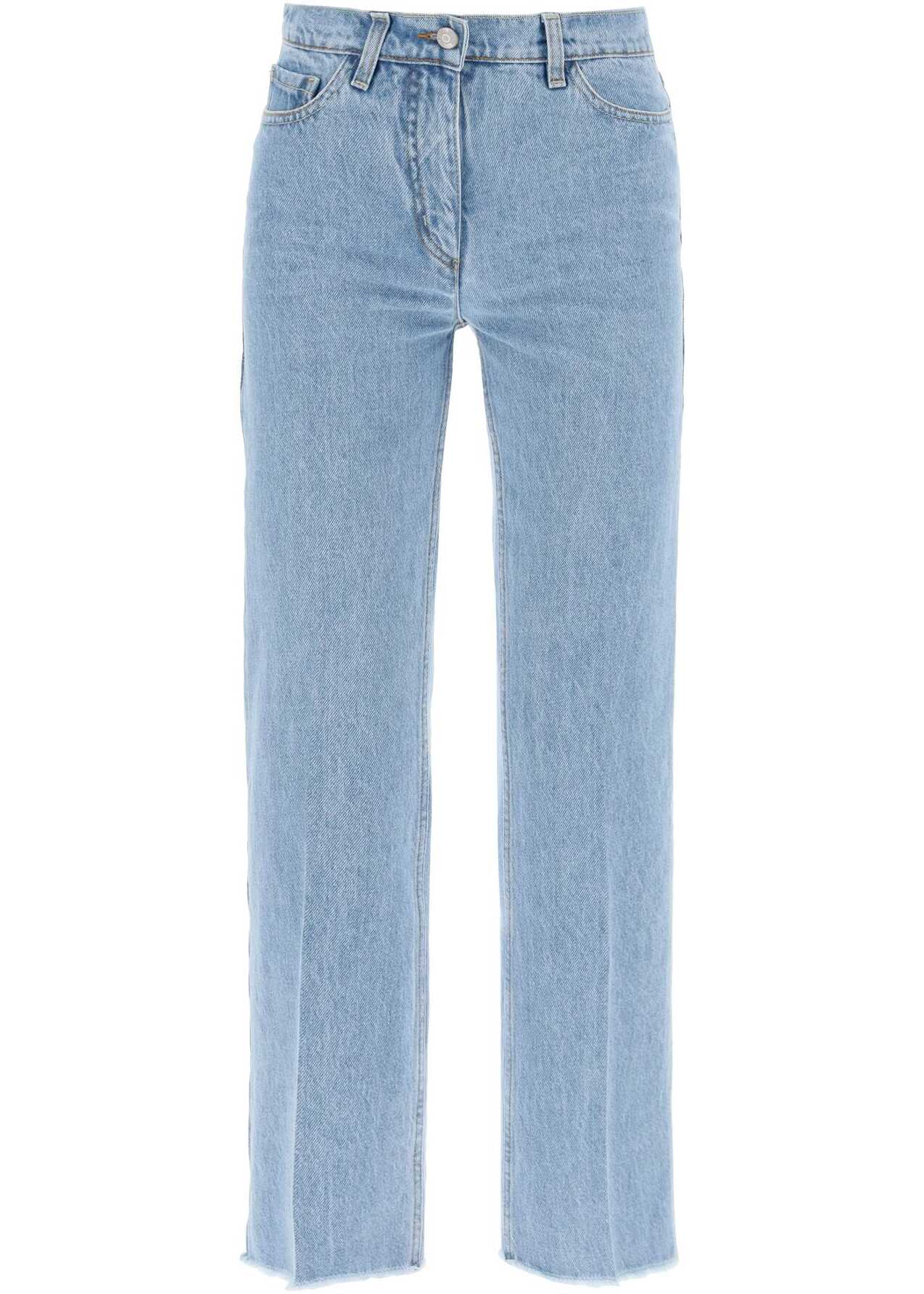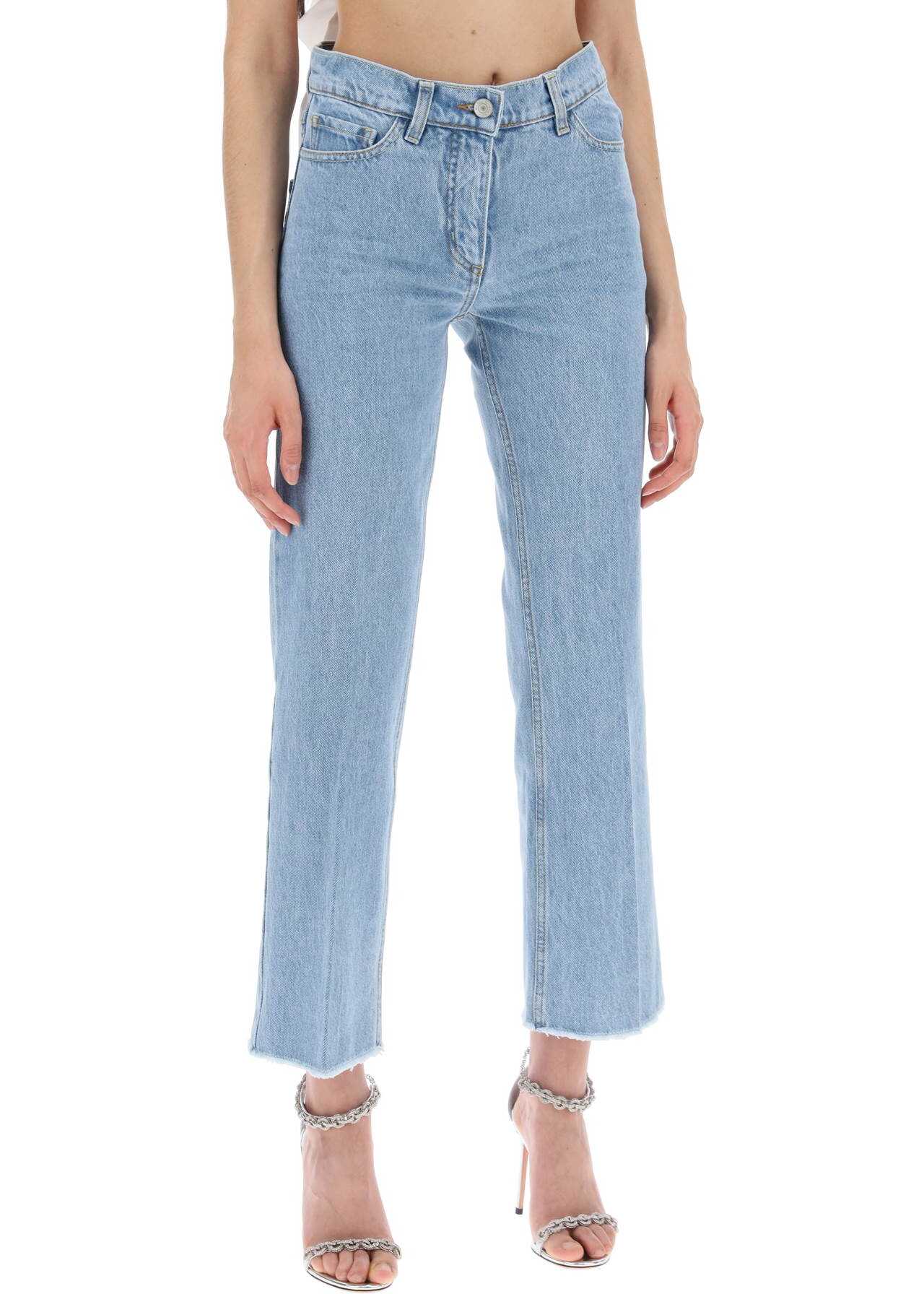The Magda Butrym five-pocket jeans are characterized by a low-waisted, slim cut with a slightly flared cropped bottom and a raw edge finish. They feature belt loops and a hidden front closure.