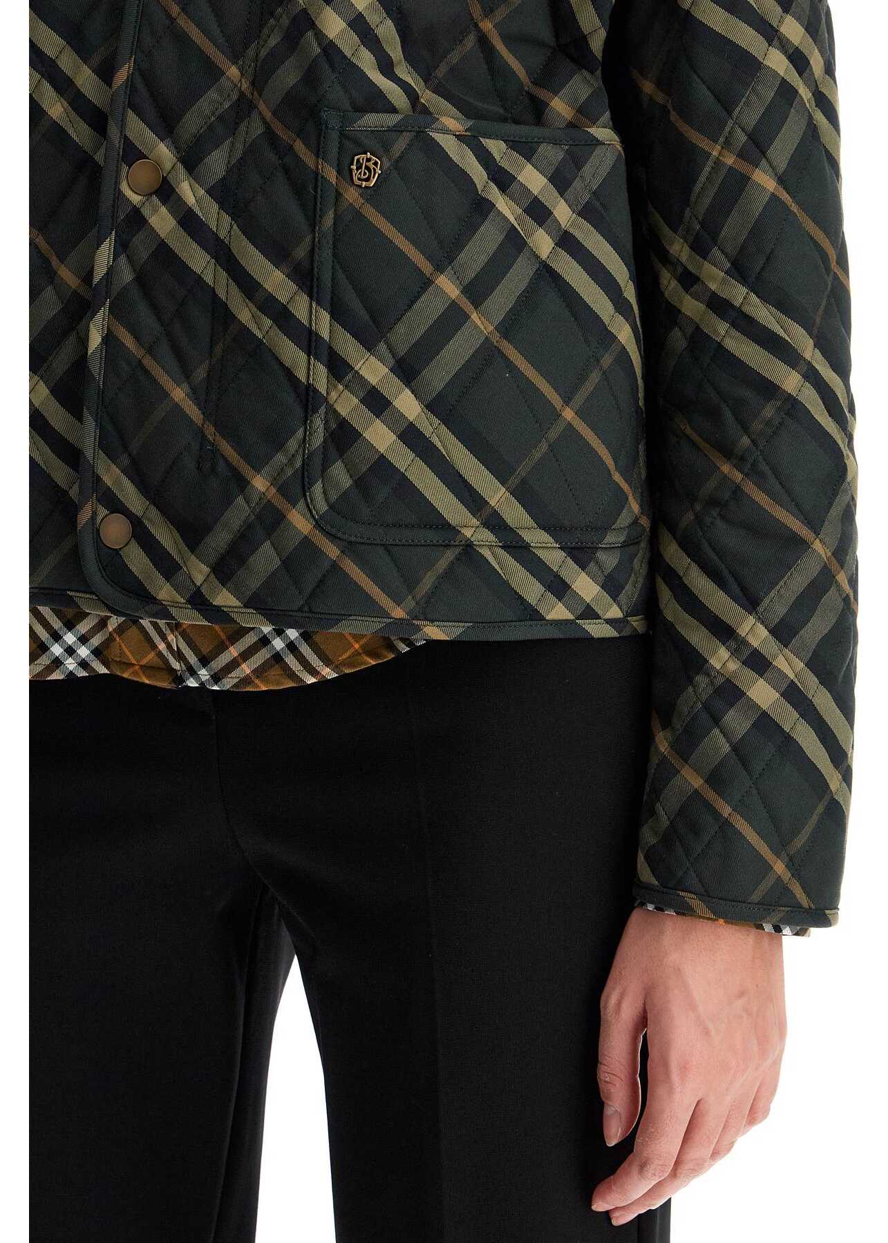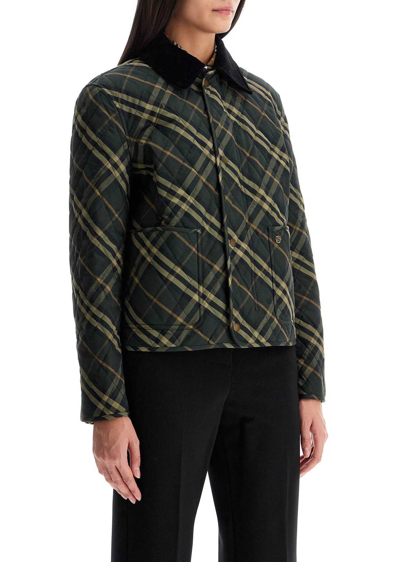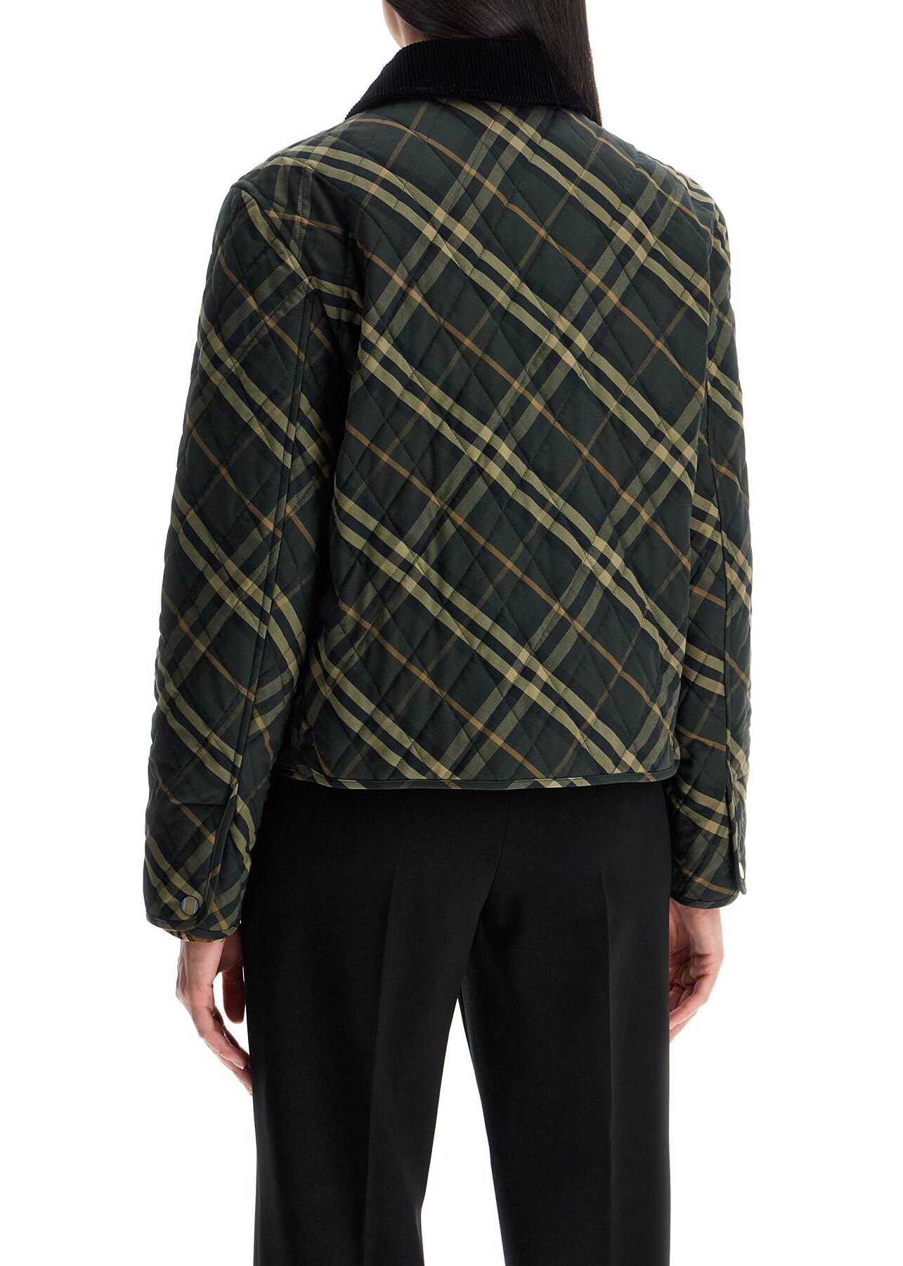The Burberry country jacket is made of cotton twill with a Check pattern and features a cropped, slightly boxy cut. It is finished with a corduroy pointed collar and a B charm applied to one of the two front patch pockets. The jacket has snap button and invisible zip closure, rounded single-button cuffs, and side slits closed by snaps. The model is 177 cm tall and wears size S.