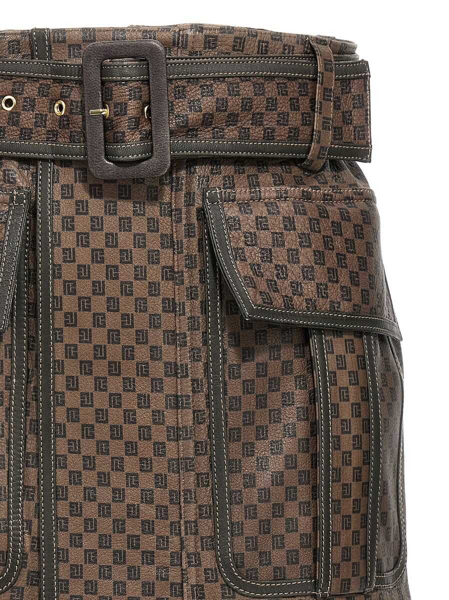 Leather skirt with all-over mini monogram logo, belt at the waist, and covered front zip closure