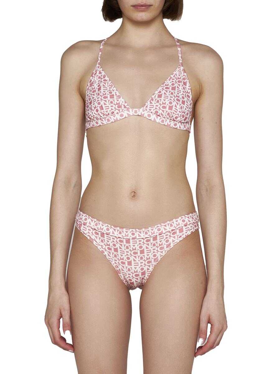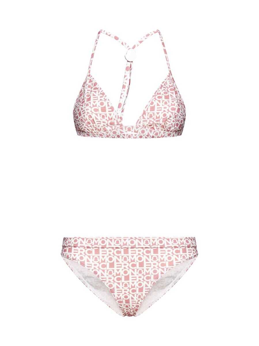 logo-print bikini from MONCLER featuring light pink, white, all-over logo print, halterneck, triangle cup and classic bottoms. Be mindful to try on swimwear over your own garments..