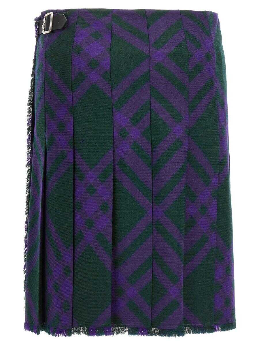 'Kilt' check print wool skirt, side button closure, B-shaped buckle, fringed edges