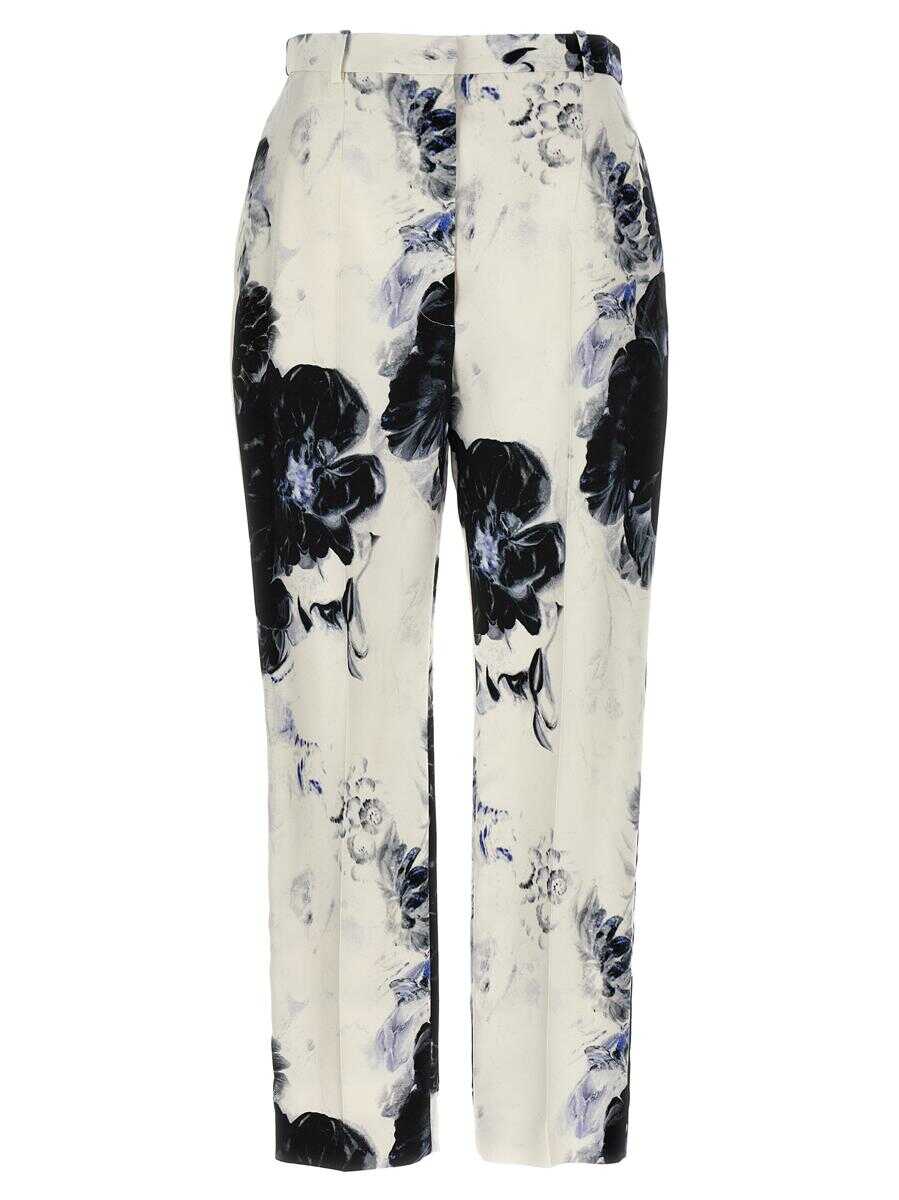 'Chiaroscuro' viscose cady pants with floral print, pockets, zip and hook closure, cigarette leg style