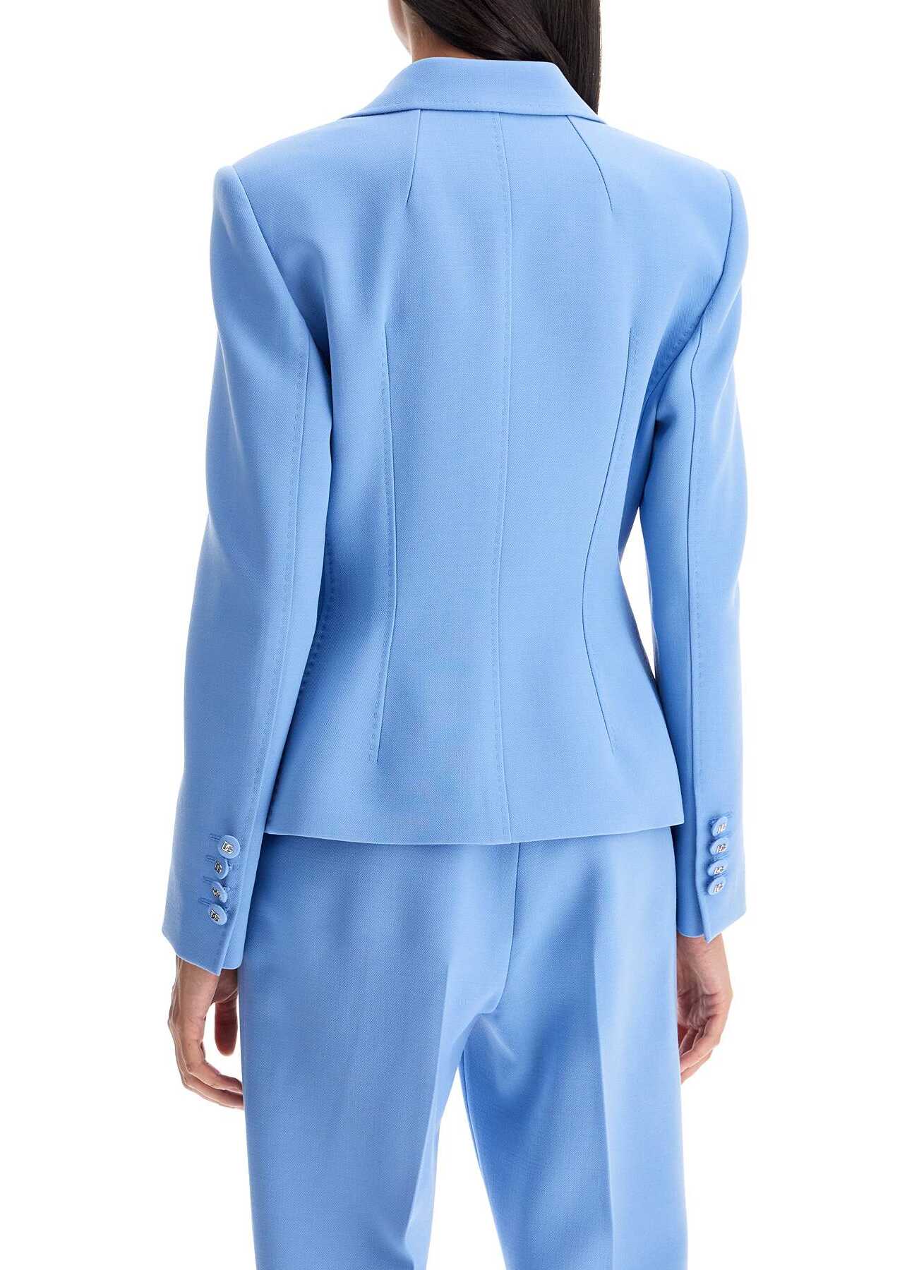This single-breasted Dolce & Gabbana jacket is made of double pure virgin wool crêpe, featuring a fitted silhouette with padded shoulders and wide notched lapels. Adorned with DG logo-covered buttons, it is lined in silk and has two flap pockets.