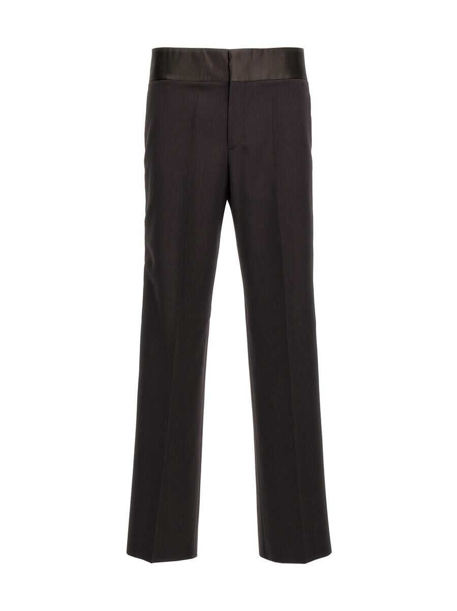 Wool pants with central crease, band detail at the waist, side silk bands, a hook-and-eye zip and button closure, pockets