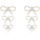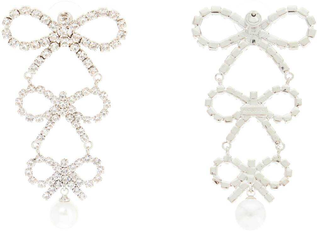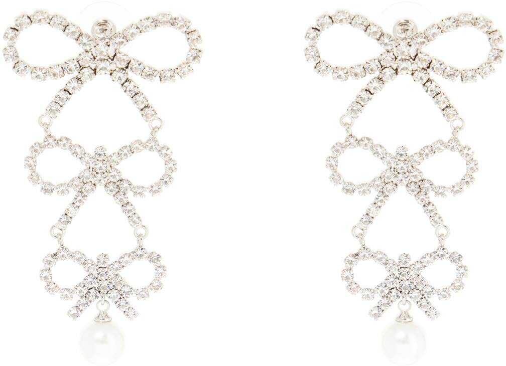 These Self Portrait dangling earrings feature a three-tiered structure of degradé bows in silver-finished brass, embellished with zircon crystals and a final pearl. They have a stud closure for pierced lobes.
