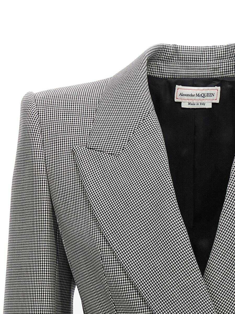 Double-breasted, houndstooth wool blazer with button closure, shoulder pads, pockets, long sleeves, and back split